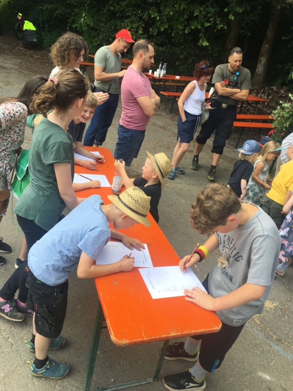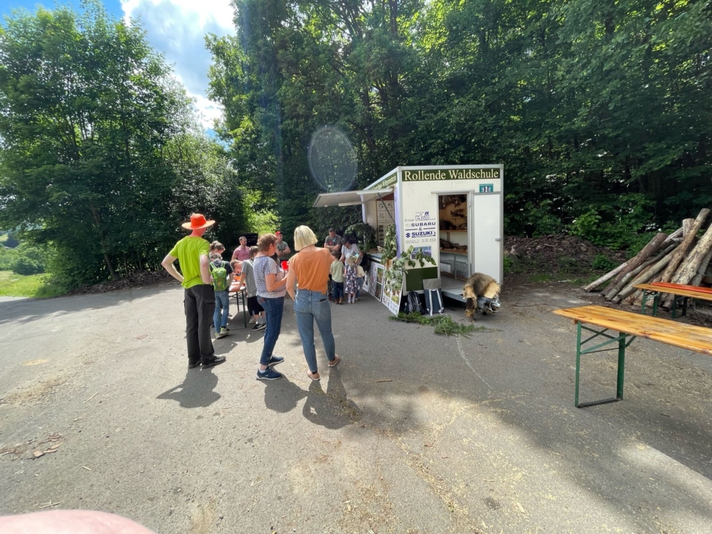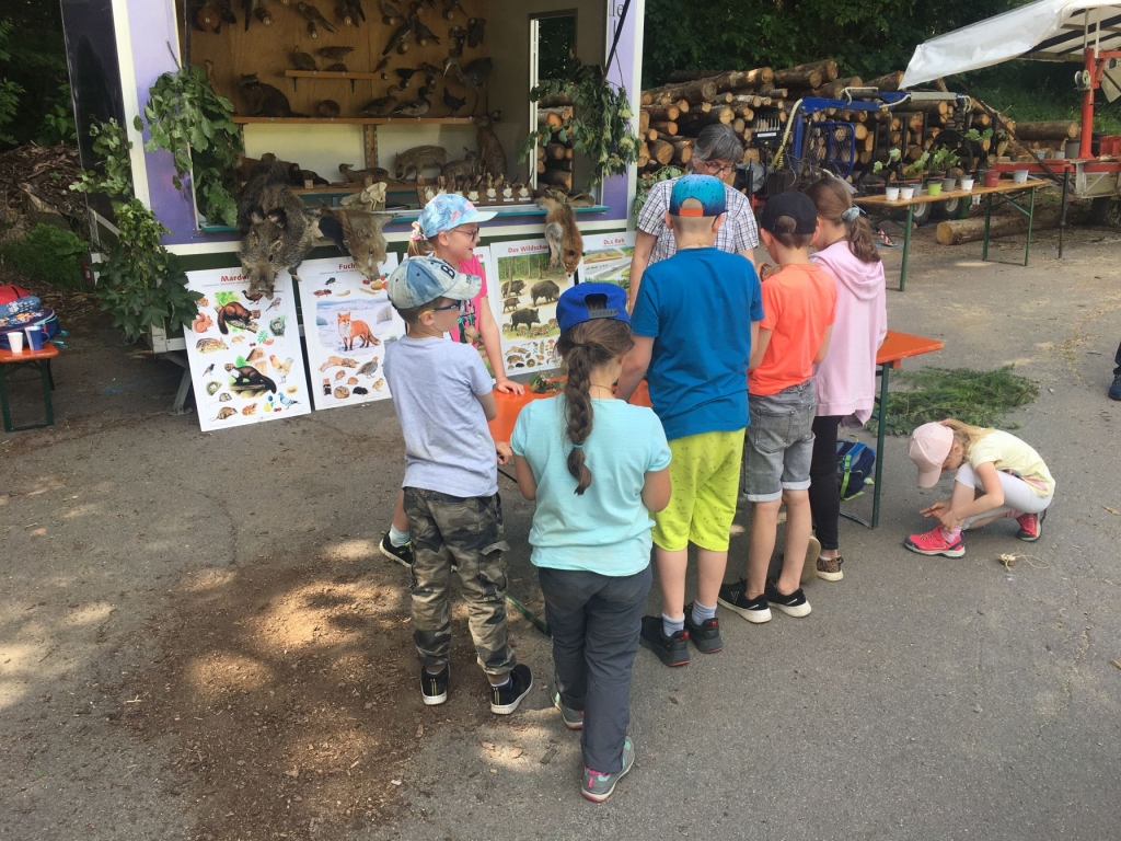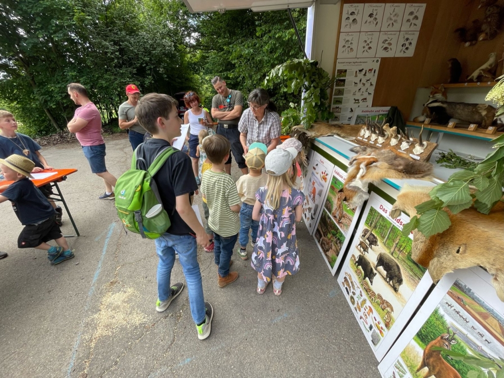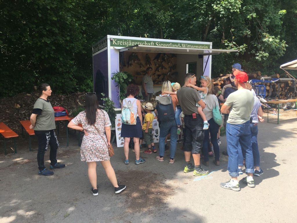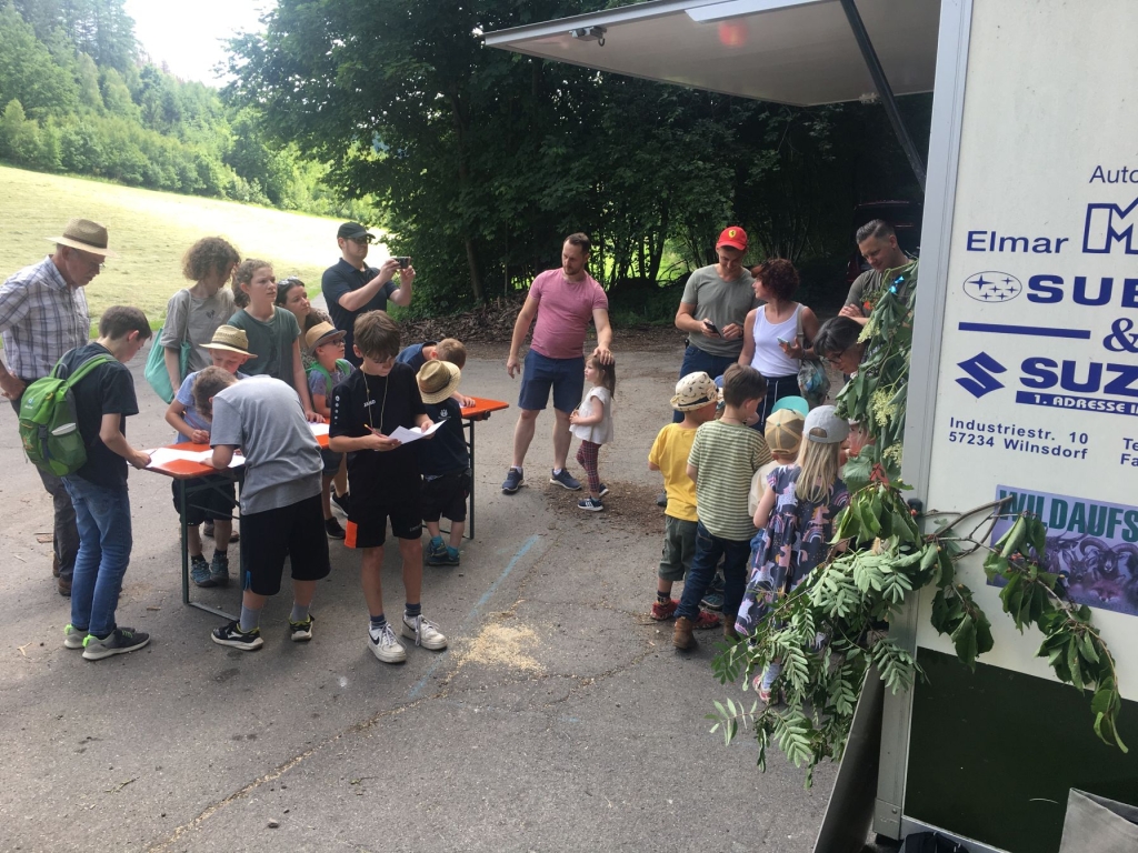 Schule kann Spaß machen – besonders dann, wenn sowohl der „Lernstoff“ als auch der „Lernort“ recht außergewöhnlich sind: Mehr als 30 Mädchen und Jungen folgten jetzt einer Einladung des Arbeitskreises Dorferneuerung und Dorfgeschichte zu einer Walderkundung und zum Besuch der „rollenden Waldschule“ der Kreisjägerschaft Siegerland-Wittgenstein. Etliche jüngere Kinder wurden dabei von ihren Eltern begleitet. Im „Grümmel“, in ruhiger Umgebung und am Übergang von Wiesen zum Wald, war für den mit umfangreichem Anschauungsmaterial ausgestatteten Wagen ein idealer Standort gefunden worden.
