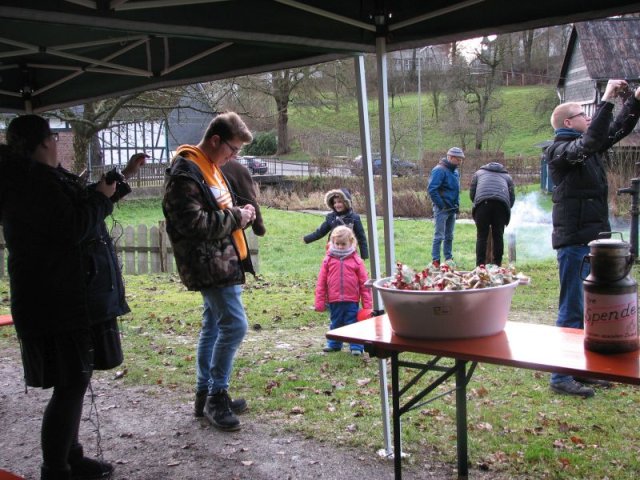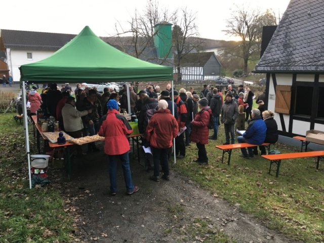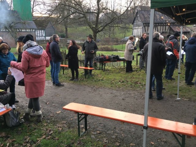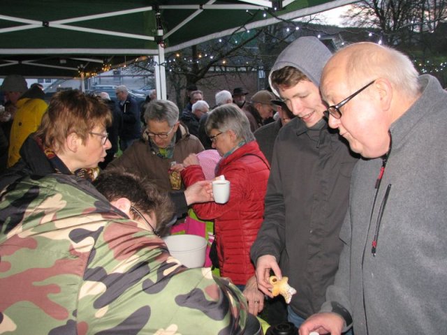 Das am Vortag von den Helfern des Arbeitskreises in „Möllersch“ Küche und im Backes „fabrizierte“ Spritzgebäck fand während und nach dem Konzert dankbare Abnehmer. Ebenso trafen die am Adventssonntag aus guten Zutaten frisch gebackenen Stutenmänner den Geschmack des Publikums. Die zahlreichen Gäste, Musiker und Helfer waren demnach mit süßem Gebäck, aber auch mit Kaffee und heißem Kakao gut versorgt. Die Entstehung und Bedeutung der vom Posaunenchor vorgetragenen Lieder wurden vom Chorleiter anschaulich erläutert, die zuvor verteilten Liedtexte erleichterten auch den nicht so ganz „textfesten“ Sängerinnen und Sängern das Mitsingen. Das Wetter spielte bei der Veranstaltung sehr gut mit: Während es am Vortag und selbst am Sonntagvormittag noch geregnet hatte, blieb es während der Veranstaltung trocken. Die für Plätzchen, Kuchen und Kaffee eingegangenen Spenden werden auch in diesem Jahr wieder einem sozialen Zweck zugeführt. Älteren Mitbürgern im Dorf wurde je eine Tüte mit selbstgebackenen Plätzchen aus dem Backes zugestellt.