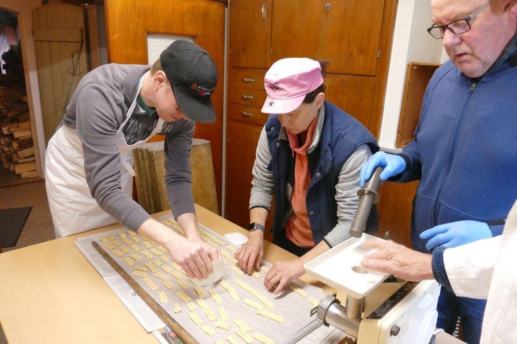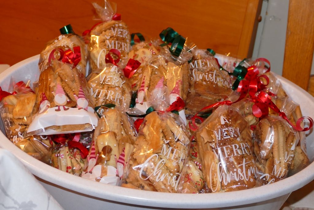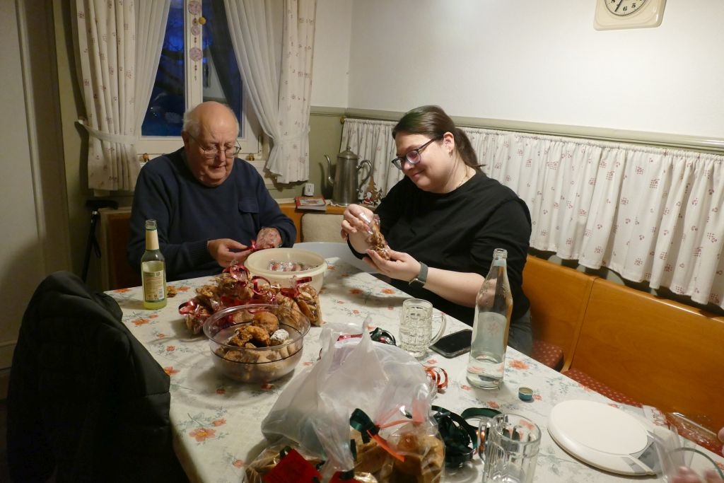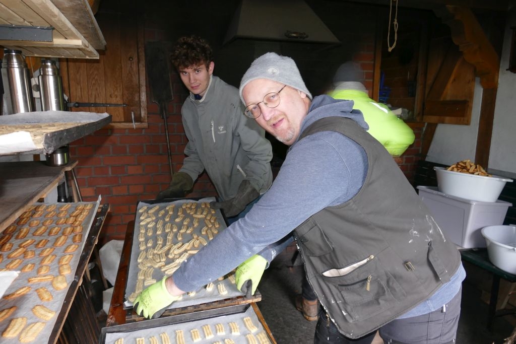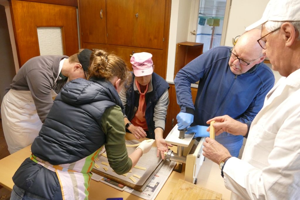 Dem schon traditionellen Plätzchenbacken des Arbeitskreises im Advent war ein voller Erfolg beschieden: Der Teig für das Spritzgebäck war wieder „dezentral“ in 12 Haushalten vorbereitet worden. Am Samstag, dem 13. Dez. 2025, drehten dann die Helferinnen und Helfer in „Schusdersch Bienenküche“ gut 28 kg Plätzchenteig „durch den Wolf“ und