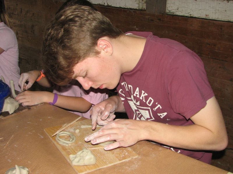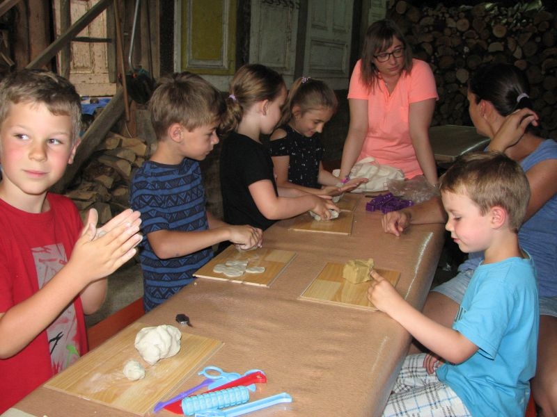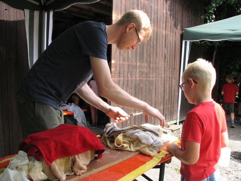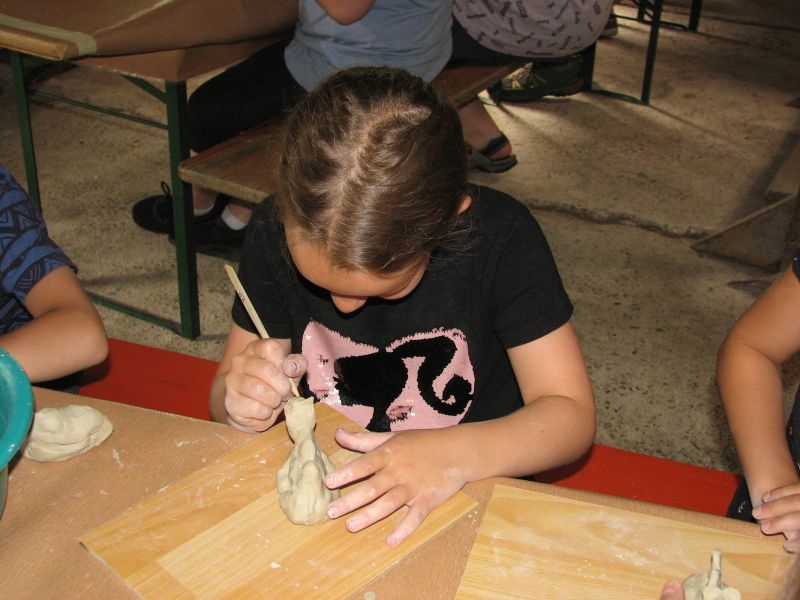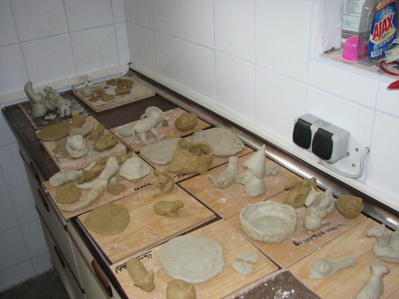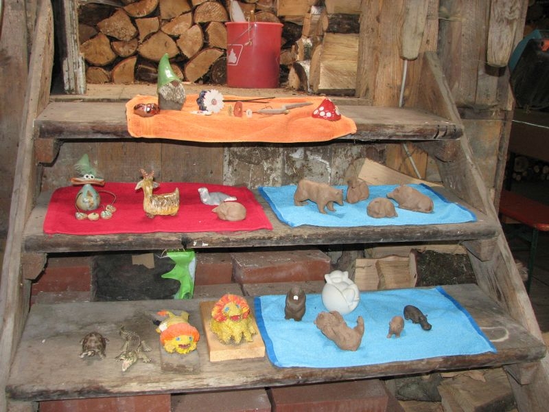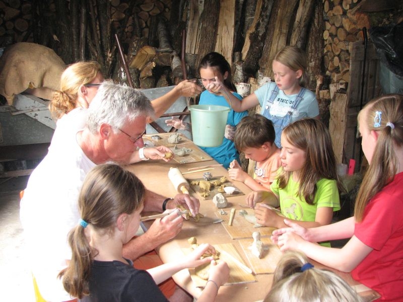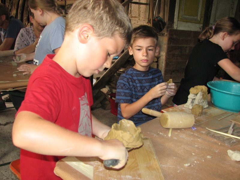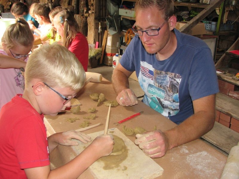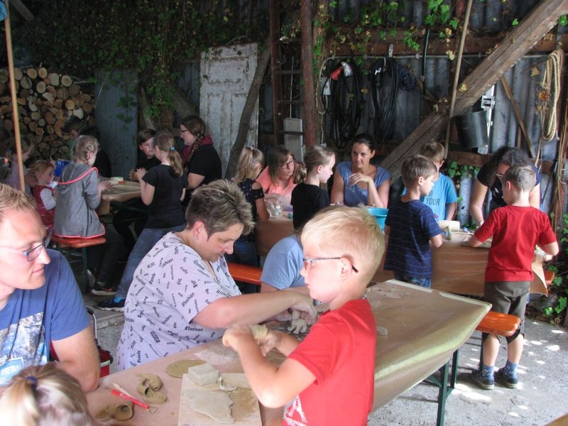 Auch vom Verlauf her war die intensiv und vorausschauend vorbereitete Aktion in „Schusdersch“-Scheune ein voller Erfolg. Bis zu zwei Stunden waren die Jungen und Mädchen mit Disziplin, Ausdauer und künstlerischem Geschick bei der Arbeit – zum Teil mit Hilfestellung der Erwachsenen, zum Teil aber auch ganz eigenständig. Als „Muster“ ausgestellte fertige Tonarbeiten – zahlreiche aus Ton modellierte Tiere, Blumen, Türschilder u. v. m. – boten den Kindern wertvolle Anregungen für ihr künstlerisches Schaffen. Von den zur Verfügung gestellten Werkzeugen und Hilfsmittel, wie z. B. Unterlagen oder Spateln unterschiedlicher Form, machten sie dabei fachmännisch und ausgiebig Gebrauch. Aber auch den anwesenden Eltern sah man durchaus an, dass ihnen die Beschäftigung mit Ton Spaß machte. Der guten Stimmung förderlich war zudem ein gemeinsames Kaffeetrinken mit selbstgebackenem Kuchen. Das Ergebnis der des Modellierens mit Ton in Form einer großen Sammlung der entstandenen Exponate wurde anschließend in „Schusdersch“-Waschküche zwischengelagert, wo die Kunstwerke zunächst trocknen konnten. Danach erfolgte ein erster vorsichtiger Brand bei etwa 600°C, ein so genannter „Schrühband“. Einzelne Teile, die nicht ausreichend miteinander verknetet waren, wurden danach repariert und mit einem temperaturbeständigen Klebstoff wieder sorgfältig verbunden. Während eines am 4. August 2018 anberaumten Termins konnten die Kinder entschieden, welche Teile glasiert werden sollen – sie könnten danach draußen stehen – und welche mit Acrylfarben bemalt und anschließend mit Klarlack konserviert werden sollen. Die letztgenannten erhalten jetzt in Kürze einen zweiten Brand bei etwa 1000 °C, die erstgenannten werden zuerst mit in Wasser gelöstem Farbstaub glasiert und erst danach nochmals gebrannt. Für das Bemalen und Glasieren der Kunstwerke wird mit den Teilnehmern der Aktion nach den Sommerferien ein neuer Termin abgesprochen.