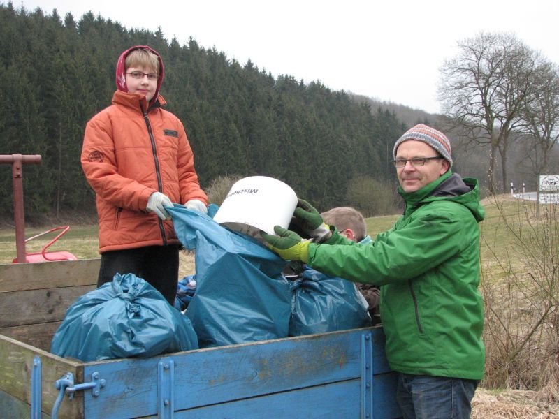 Zwar konnten in der Vergangenheit die meisten „Altlasten“ an Unrat bereits aus der Landschaft entfernt werden, gleichwohl summieren sich achtlos weggeworfene Zeitungen, Trinkbecher, Plastiktüten oder Flaschen von einem Frühjahr zum anderen immer wieder zu einer ganzen Wagenladung. Besonders schlimm trifft es die Umgebung der Verbindungsstraßen zwischen den Ortschaften: Die Entsorgung von Müll durch das geöffnete Autofenster scheint nach wie vor gängige Praxis zu sein. „Beim Spaziergang möchte ich die Natur genießen und mich nicht über den Abfall in der Landschaft ärgern müssen“ – so begründet Heiner Bald vom Arbeitskreis Dorferneuerung seine regelmäßige Teilnahme an der Aktion. Zu den eifrigsten Helfern zählen übrigens die Kinder. Aber nicht nur für sie, auch für die Erwachsenen ist die gemeinsame Arbeit ein Stück gelebter dörflicher Gemeinschaft. Bei heißem Kakao, Kaffee und Kuchen in „Gisselersch“ Scheune fand die Aktion ihren gebührenden Abschluss.