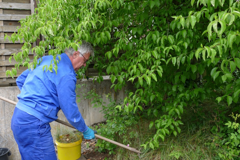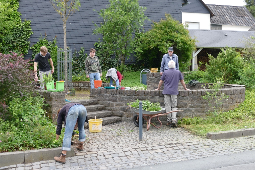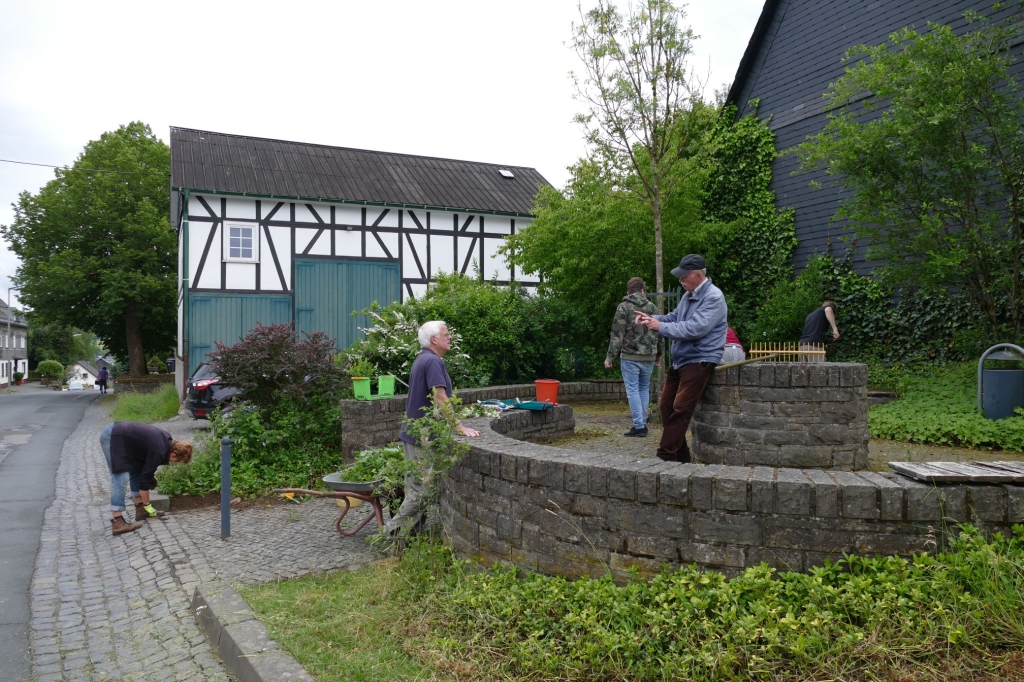 Bei einem weiteren Arbeitseinsatz am 10. Juni 2020 widmeten sich neun Mitglieder unserer Gruppe der Sitzecke bei Hürschdersch. Es wurde gemäht, das Unkraut bekämpft, gefegt und der Grünschnitt später abgefahren. Außer an der Sitzecke bei Hürschdersch und am Glockenturm fallen auch rund um den Backes fortlaufende Pflegearbeiten an, darunter der Grasschnitt mit dem Balken- oder Rasenmäher, das Trimmen der Böschungen und der Abtransport des Schnittgutes. Einzelne Helfer oder Helferteams nehmen sich dieser Aufgaben fortlaufend an. Darüber hinaus gilt es immer wieder besondere Arbeiten zu erledigen: So wurden in diesem Sommer die Pfähle entlang der Weges am Backes erneuert und die Dachentwässerung des Backhauses grundlegend instandgesetzt.