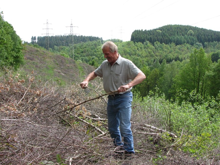Wer Brot backen will, der braucht Schanzen - dieser Erkenntnis folgend zog es die Mitglieder des Arbeitskreises Dorferneuerung und Dorfgeschichte auch in diesem Jahr in den Hauberg. Mit Knipp und Schanzenbinder versehen ging es per Traktor, Fahrrad oder Auto diesmal ins Terrain des Nachbarortes Meiswinkel.