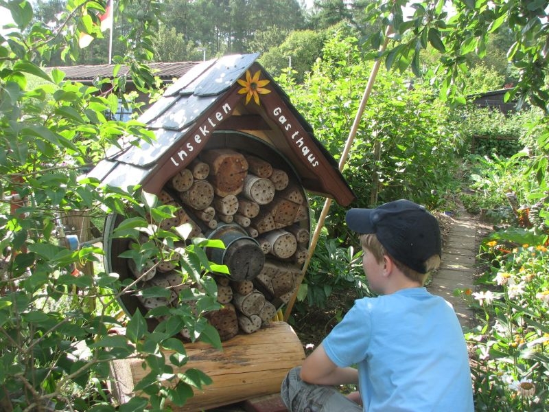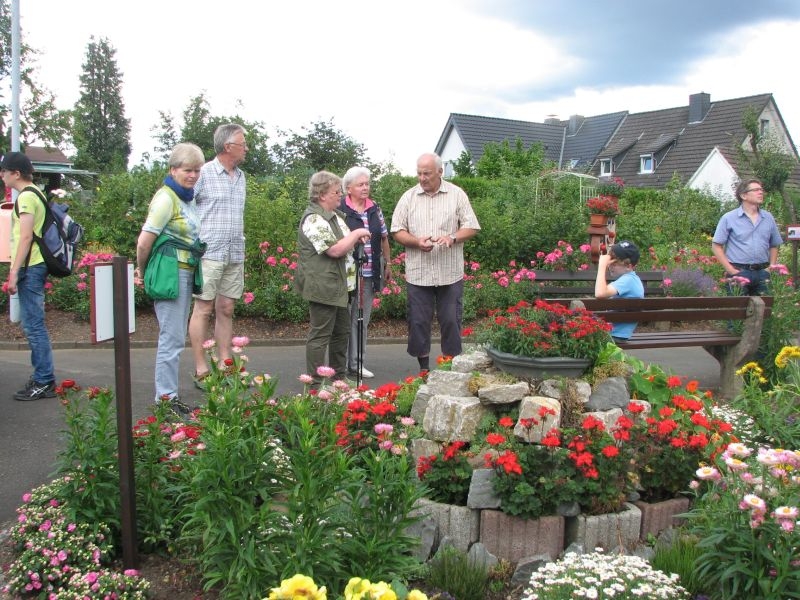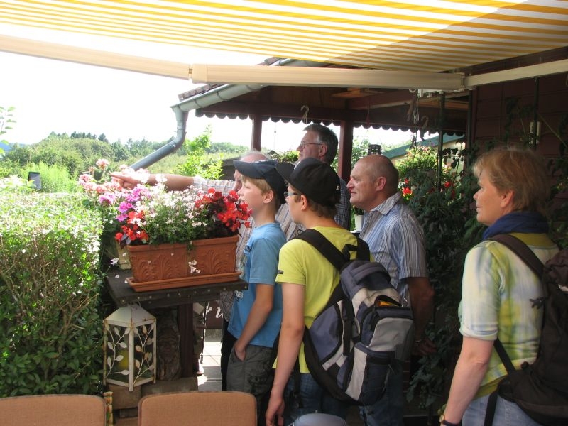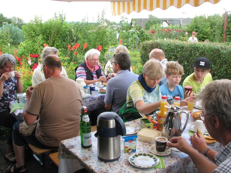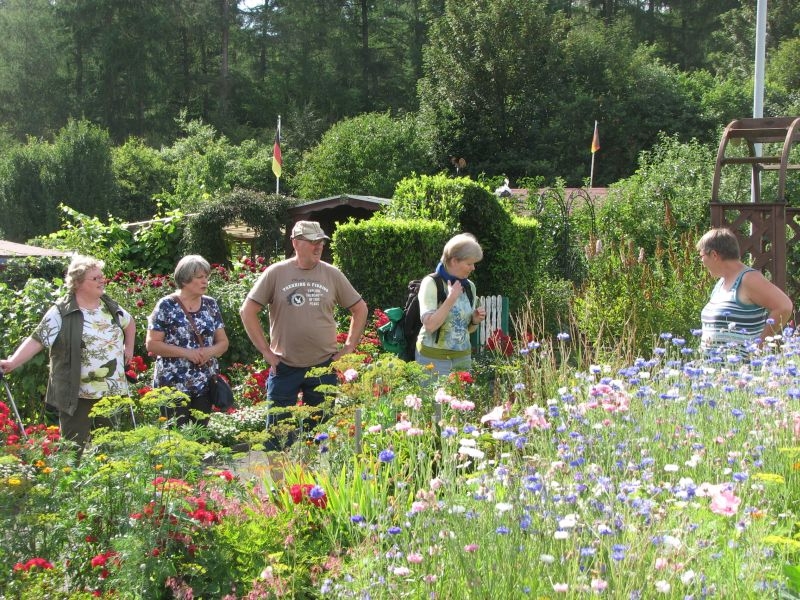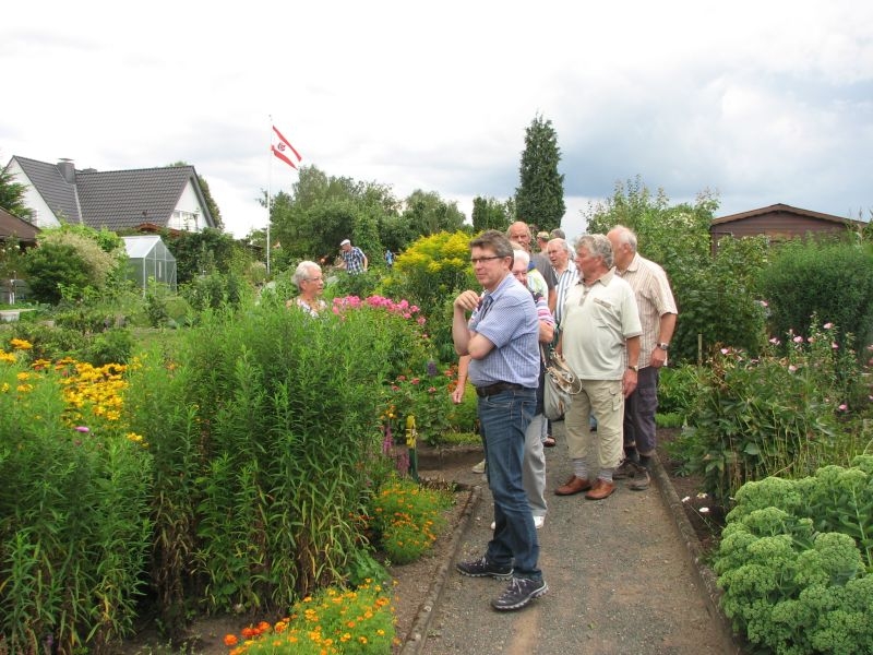 Von „Kolwe“ aus wanderte unsere Gruppe am 25. Juli 2014 über den „Posten“ zum Kleingarten, der sich wahrlich als „gärtnerisches Paradies“ erwies. Die Blumenpracht, die Vielfalt von Flora und Fauna, aber auch die unterschiedliche, aber liebevolle Gestaltung der unmittelbar nebeneinanderliegenden Gartenparzellen beeindruckte und begeisterte die Teilnehmer. Die anschaulichen und informativen Ausführungen von Herrn Manteuffelwurden aufmerksam verfolgt – aber auch die vortreffliche Bewirtung durch die Eheleute Manteuffel mit Waffeln und selbstgemachter Marmelade dankend und gerne angenommen.