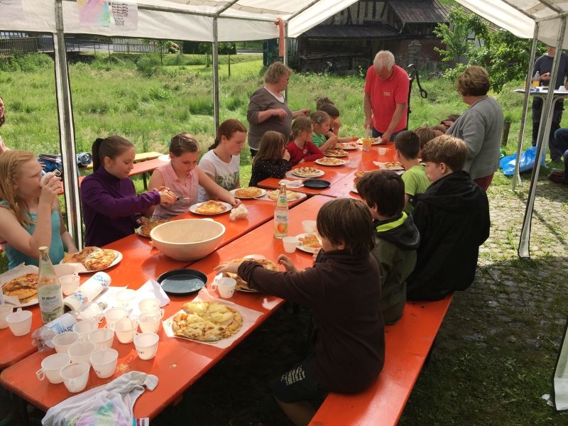 Fest in Kinderhand war am 4. Juni 2016 der Backes am Zinnwald in „Hollekusse“. Gut 20 Jungen und Mädchen übten sich als Pizzabäckerinnen und Pizzabäcker. Sie lieferten so den Beweis, dass der Steinofen nicht allein gutes Brot und Kuchen hervorbringen kann.