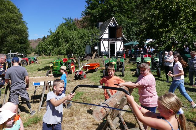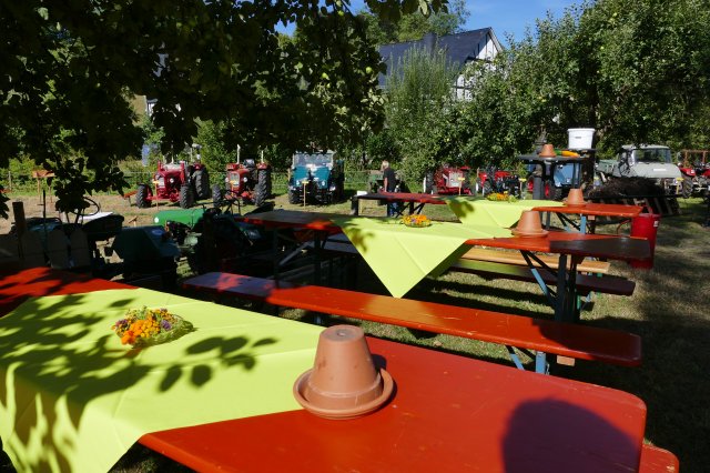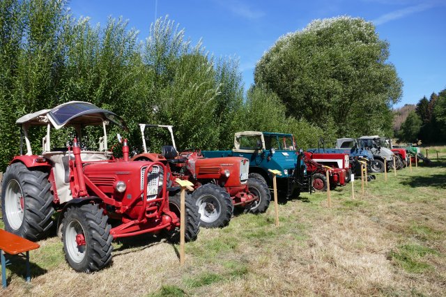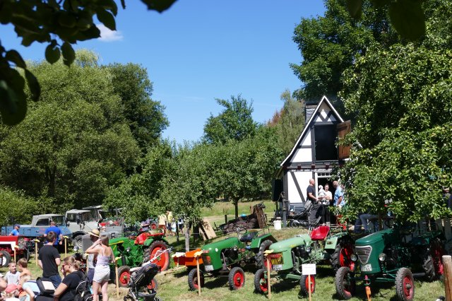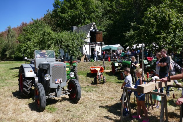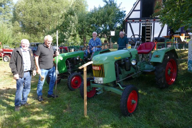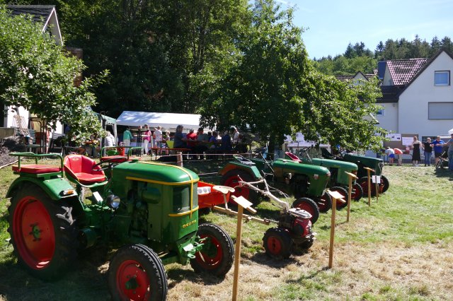 Aber auch für die Erwachsenen war mit kulinarischen und technischen Leckerbissen bestens gesorgt. Bei den Speisen konnte zwischen selbstgekochter Erbsensuppe, herzhaften Grillgerichten und selbstgebackenem Kuchen gewählt werden, im Backes ließen sich die Gäste beim Backen von Brot und Kuchen die Funktion des Steinofens erklären und an den Tischen war Zeit und Gelegenheit für ausführliche Gespräche. Dem Anspruch, neben der Förderung sozialer Kontakte den Festbesuchern stets auch heimatkundliche oderhistorische Informationen anzubieten und so zum Gedankenaustausch anzuregen, wurde das Fest einmal mehr gerecht: Unter dem Motto Kräftig und unverwüstlich waren schon am frühen Morgen im Wiesengrund vor dem idyllisch gelegenen Backhaus 17 historische Schlepper und Zugmaschinen aufgefahren, vom 15 PS Deutz aus dem Jahre 1952 über Unimogs aus den aus den frühen 1960ern bis zum Einachsschlepper mit Triebachsanhänger. Einige der Oldtimer präsentierten sich vorbildlich restauriert, andere von den Spuren des jahrzehntelangen Gebrauchs gezeichnet, etliche davon sind nach wie vor im Einsatz. Ein Quiz mit Fragen zur Motorisierung der örtlichen Landwirtschaft und zu den ausgestellten Zugmaschinen wartete mit interessanten Informationen auf. So war zu erfahren, dass allein in Langenholdinghausen derzeit mehr als 45 Traktoren und Zugmaschinen stehen, die  alle zusammen gerechnet - eine Gesamtleistung von über 2400 PS aufweisen. Die Beschäftigung an und mit den Traktoren wird dabei von etlichen der Besitzer als Steckenpferd betrachtet. Die heute mit Hilfe der Traktoren verrichtete Arbeit wurde 1950 noch von 50 Tiergespannen, aber einer umso größeren Zahl von Arbeitskräften vollbracht. Informationstafeln zu den vielfältigen Aktivitäten des Arbeitskreises Dorferneuerung in der jüngeren Zeit rundeten das Rahmenprogramm der Veranstaltung ab.