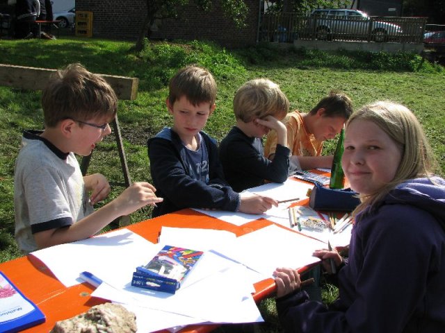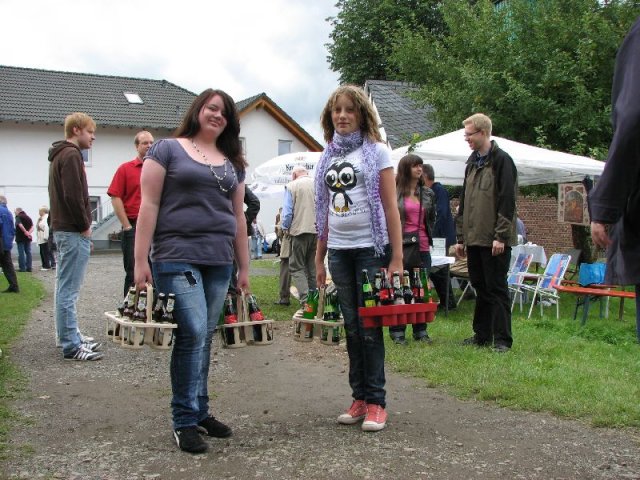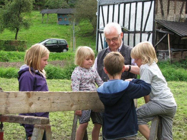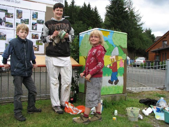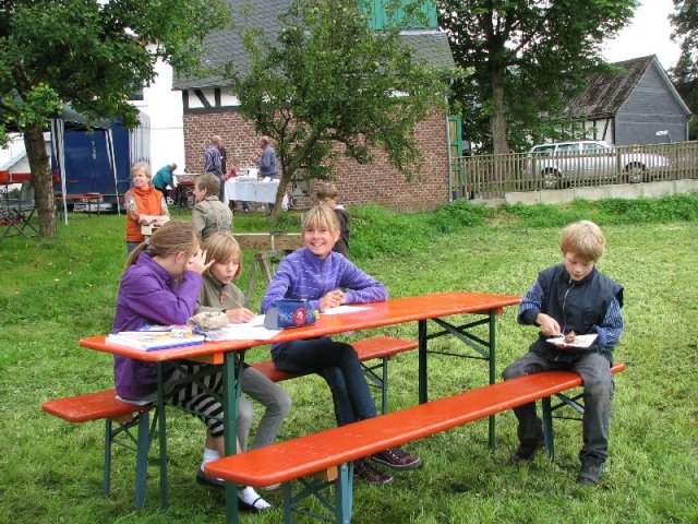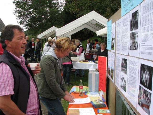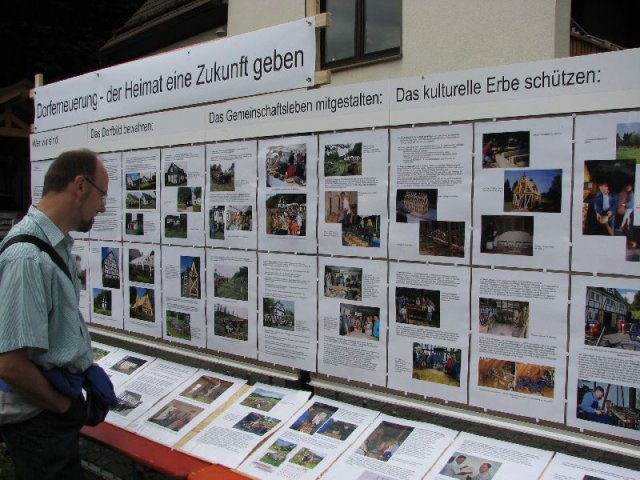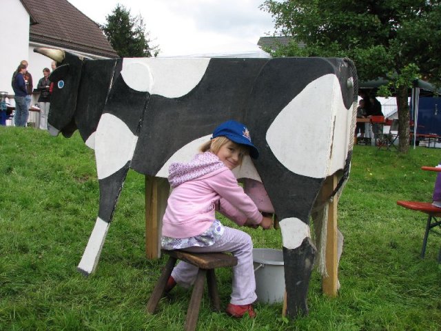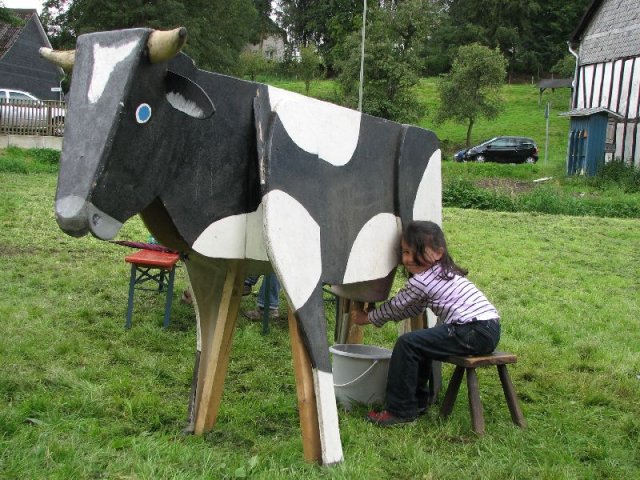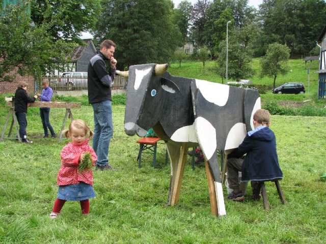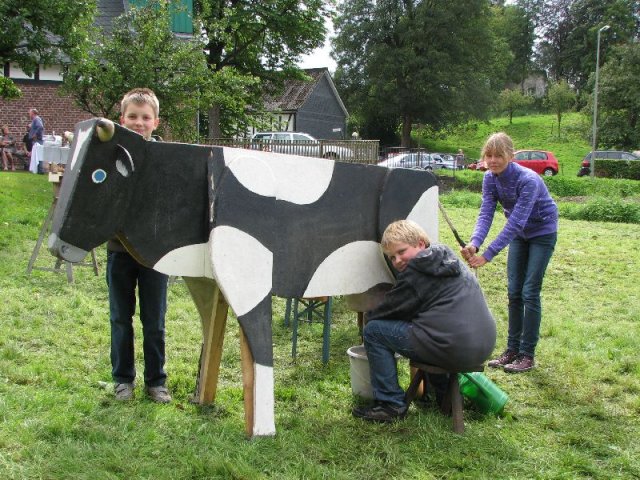 „Die Milch macht`s …“ lautete der Titel einer Dokumentation zur Geschichte und Gegenwart der Milchviehhaltung und Milcherzeugung im Dorf, in einer dazu gehörigen Ausstellung waren zahlreiche historische Gerätschaften zu betrachten – vom Melkschemel über die verschiedenen Zentrifugen bis hin zum elektrisch betriebenen Butterfass. Ihre aktuellen und historischen Kenntnisse konnten die Festteilnehmer in einem Quiz unter Beweis stellen. Derweil waren die Kinder erfolgreich damit beschäftigt, in einem Malwettbewerb die schönste Kuh im Dorf bildlich festzuhalten oder sich darin zu üben, die Kuh „Yvonne“ zu füttern und zu melken. Letztere erwies sich dabei als überaus geduldig, so wie man es von einer Kuh aus Holz auch erwarten kann … ! Neben Gesprächen in der beschaulichen Umgebung des Backhauses nahmen viele Gäste die Gelegenheit wahr, sich über die Aktivitäten des Arbeitskreises in und für Langenholdinghausen genauer zu informieren: Unter der Überschrift „Dorferneuerung – der Heimat eine Zukunft geben“ hatten die Mitglieder der Gruppe ihre Ziele und vielfältigen Aktivitäten aus den Bereichen Ortsbildgestaltung, Erhalt des kulturellen Erbes, Naturschutz und Förderung des Gemeinschaftslebens in Wort und Bild anschaulich dargestellt.