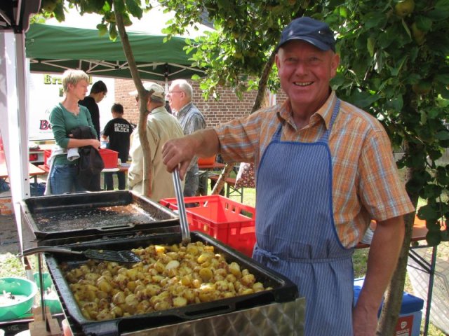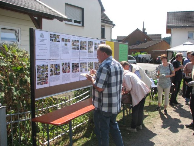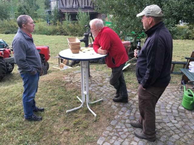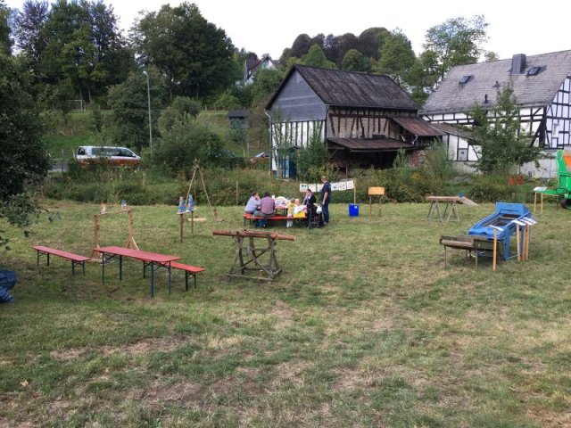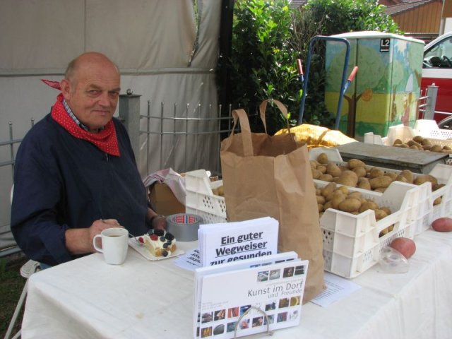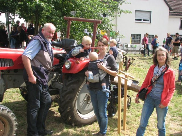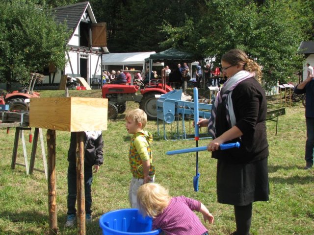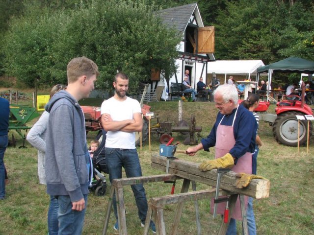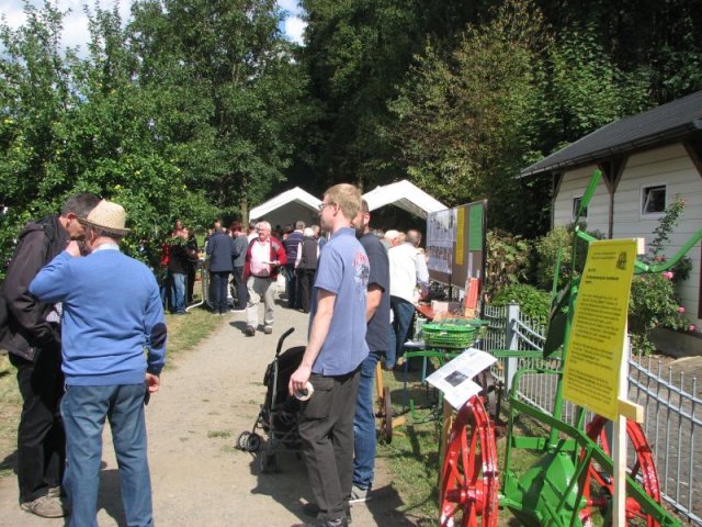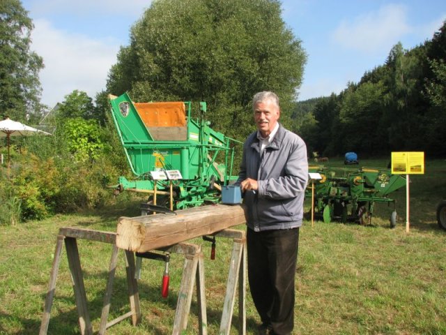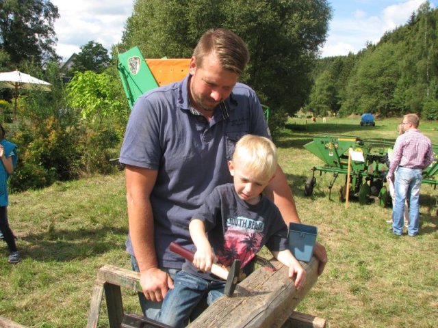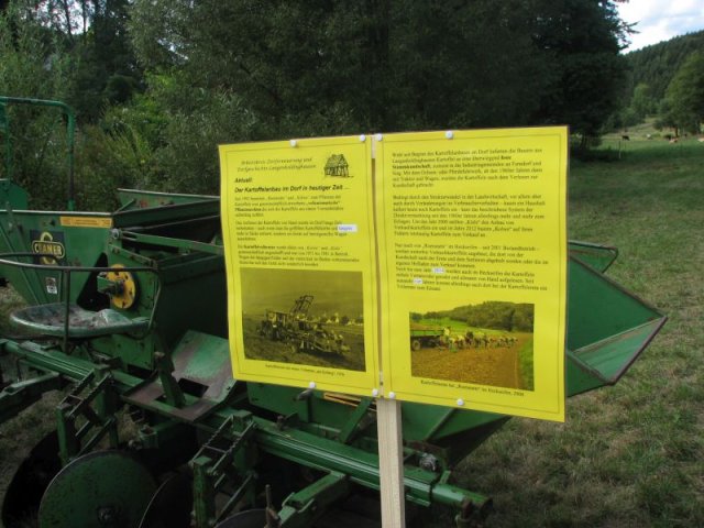In diesem Jahr stand das Fest ganz „im Zeichen der Kartoffel“: Zum Spießbraten wurden würzige Bratkartoffeln gereicht und zu den zahlreichen Erzeugnissen aus dem Steinofen gesellte sich erstmals der „Bäckel“ – ein Weißbrot mit Kartoffelanteil. Am Basteltisch inmitten zahlreicher traditioneller Spielgebote für die jüngeren Gäste übten sich Mädchen und Jungen im Kartoffeldruck – mit Hilfe der „tollen Knolle“ wurden Tragetaschen aus Jute mit ansprechenden Motiven individuell gestaltet. „250 Jahre Kartoffelanbau in Langenholdinghausen“ präsentierte der Arbeitskreis eine vollständige Sammlung nahezu aller im Kartoffelanbau einst und jetzt im Dorf eingesetzten Werkzeuge und Geräte. Gut 30 Exponate zum Pflanzen und Pflegen, zum Ernten und Sortieren der Kartoffeln waren in chronologischer Reihenfolge aufgebaut und hinsichtlich ihrer Aufgabe und Funktion in Wort und Bild beschrieben – von der Rodehacke, „Karschd“ genannt, über den Pflug oder das „Vielfachgerät Landpfleger“ aus den 1960er Jahren bis hin zum Kartoffelvollernter vom Typ „Wisent“. Alle Ausstellungsstücke sind einsatzfähig und zum Teil auch heute noch in Gebrauch. Wer am Quiz zur Ausstellung teilnahm, sah sich umso mehr veranlasst, die Ausführungen der Informationentafeln genauer zu studieren. Als Hauptgewinn winkte auch hier – wie könnte es anders sein – ein Sack schmackhafter Kartoffeln. Bei vielen älteren Festbesuchern weckten insbesondere die pferdegezogenen Kartoffelroder Erinnerungen an die Mithilfe beim herbstlichen Kartoffelaufsammeln in jungen Jahren, die kleineren Gäste drehten dagegen mit anhaltender Begeisterung die Kurbel der Kartoffelsortiermaschine oder fühlten sich auf den Sitzen der Pflanzmaschinen und Traktoren sichtlich wohl. Das sonnige Wetter war der sehr hohen Zahl von Besuchern bestimmt förderlich, es begünstige ebenso die wohl einzigartige Atmosphäre rund um das Backhaus am „Zinnwald“. Interessante Gespräche an den Ständen und Tischen und die zufriedene Mienen der Gäste zeigten den 50 aktiven Helfern, dass sich ihre Arbeit zur Vorbereitung und Durchführung des Festes gelohnt hatten.