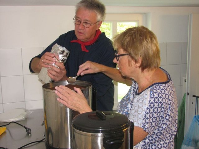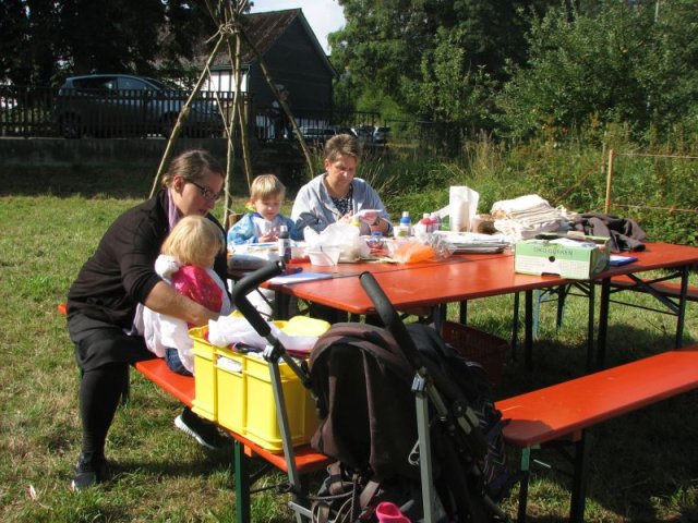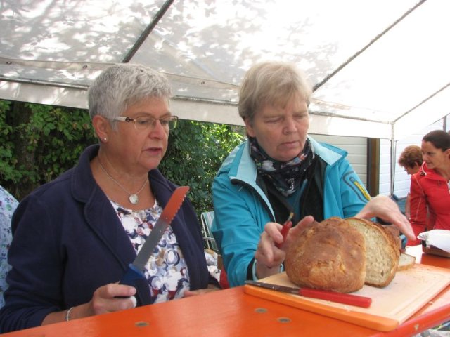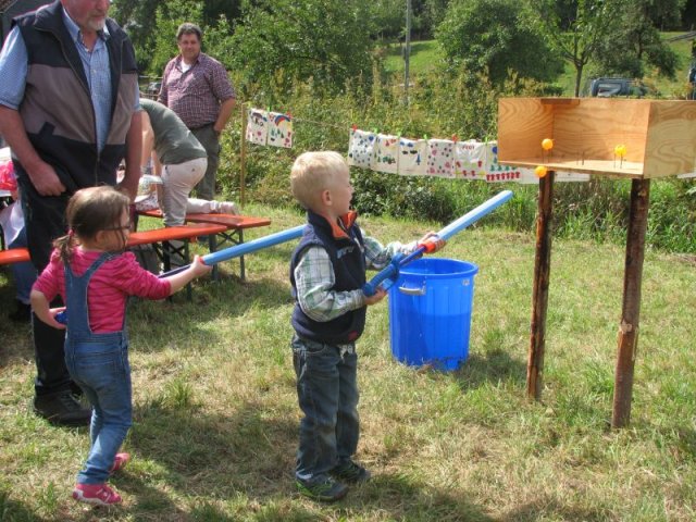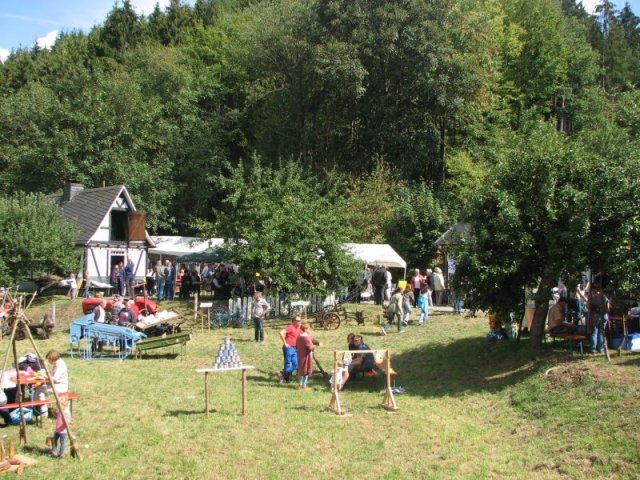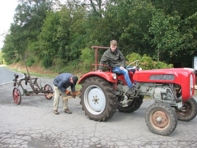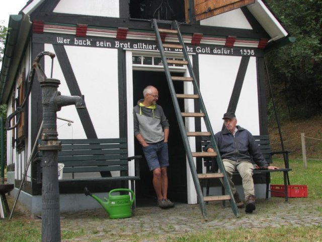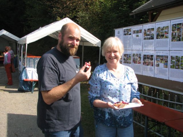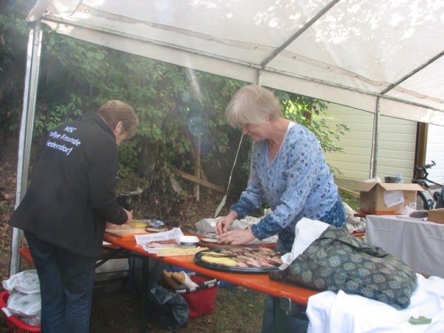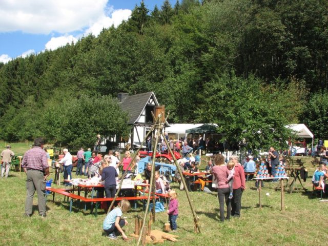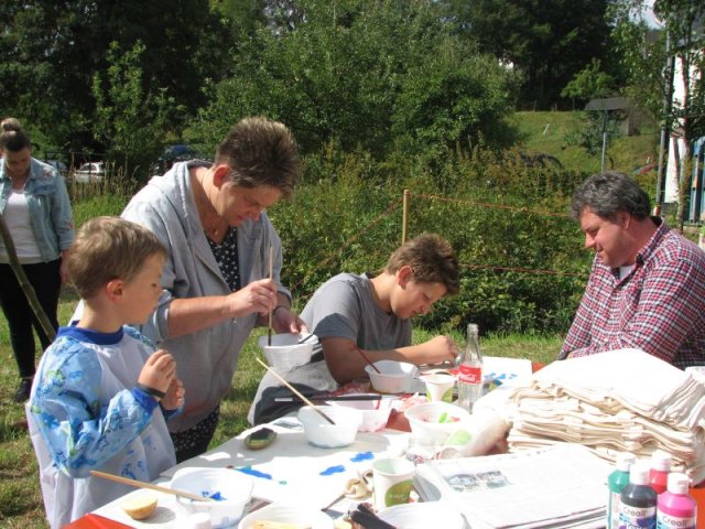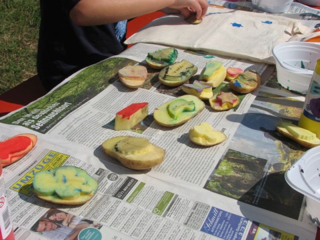 In diesem Jahr stand das Fest ganz „im Zeichen der Kartoffel“: Zum Spießbraten wurden würzige Bratkartoffeln gereicht und zu den zahlreichen Erzeugnissen aus dem Steinofen gesellte sich erstmals der „Bäckel“ – ein Weißbrot mit Kartoffelanteil. Am Basteltisch inmitten zahlreicher traditioneller Spielgebote für die jüngeren Gäste übten sich Mädchen und Jungen im Kartoffeldruck – mit Hilfe der „tollen Knolle“ wurden Tragetaschen aus Jute mit ansprechenden Motiven individuell gestaltet. „250 Jahre Kartoffelanbau in Langenholdinghausen“ präsentierte der Arbeitskreis eine vollständige Sammlung nahezu aller im Kartoffelanbau einst und jetzt im Dorf eingesetzten Werkzeuge und Geräte. Gut 30 Exponate zum Pflanzen und Pflegen, zum Ernten und Sortieren der Kartoffeln waren in chronologischer Reihenfolge aufgebaut und hinsichtlich ihrer Aufgabe und Funktion in Wort und Bild beschrieben – von der Rodehacke, „Karschd“ genannt, über den Pflug oder das „Vielfachgerät Landpfleger“ aus den 1960er Jahren bis hin zum Kartoffelvollernter vom Typ „Wisent“. Alle Ausstellungsstücke sind einsatzfähig und zum Teil auch heute noch in Gebrauch. Wer am Quiz zur Ausstellung teilnahm, sah sich umso mehr veranlasst, die Ausführungen der Informationentafeln genauer zu studieren. Als Hauptgewinn winkte auch hier – wie könnte es anders sein – ein Sack schmackhafter Kartoffeln. Bei vielen älteren Festbesuchern weckten insbesondere die pferdegezogenen Kartoffelroder Erinnerungen an die Mithilfe beim herbstlichen Kartoffelaufsammeln in jungen Jahren, die kleineren Gäste drehten dagegen mit anhaltender Begeisterung die Kurbel der Kartoffelsortiermaschine oder fühlten sich auf den Sitzen der Pflanzmaschinen und Traktoren sichtlich wohl. Das sonnige Wetter war der sehr hohen Zahl von Besuchern bestimmt förderlich, es begünstige ebenso die wohl einzigartige Atmosphäre rund um das Backhaus am „Zinnwald“. Interessante Gespräche an den Ständen und Tischen und die zufriedene Mienen der Gäste zeigten den 50 aktiven Helfern, dass sich ihre Arbeit zur Vorbereitung und Durchführung des Festes gelohnt hatten.