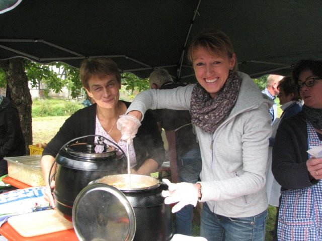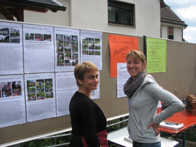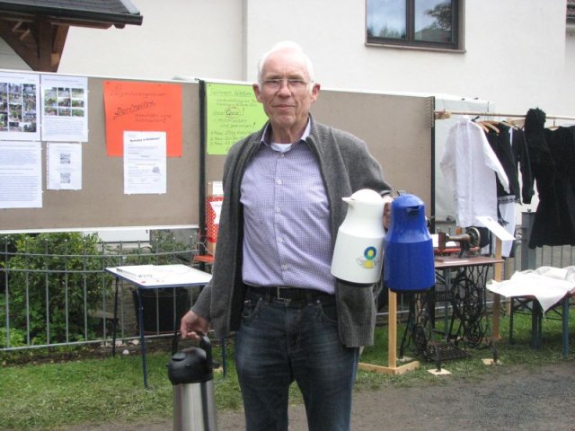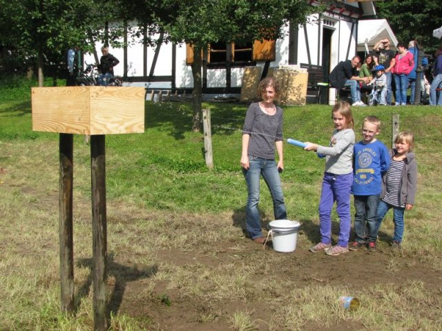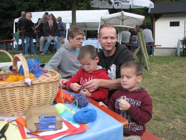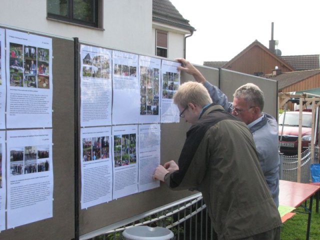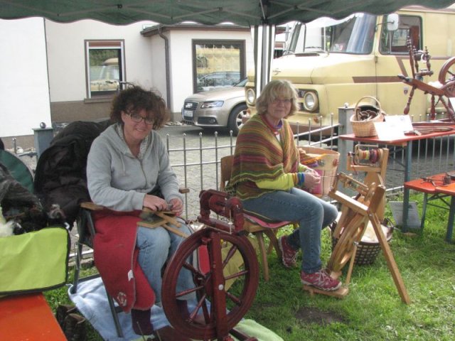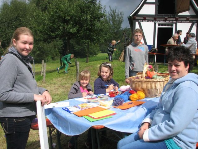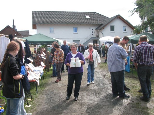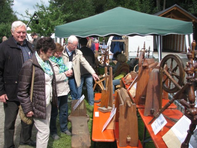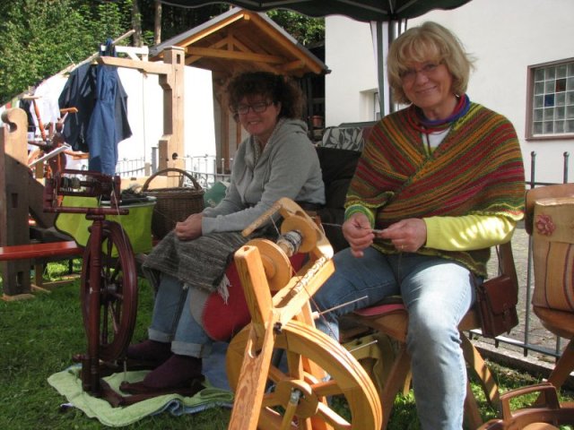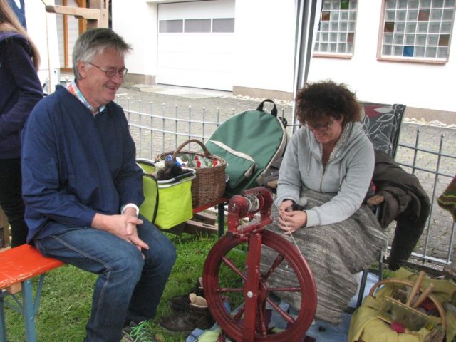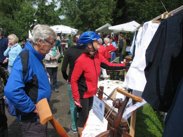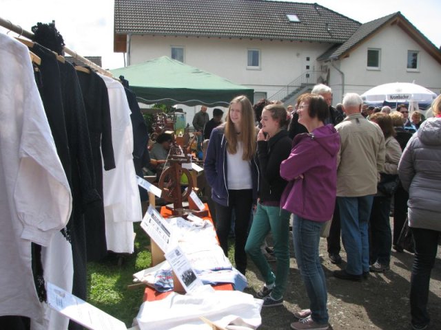 Am Weg zum Backhaus empfing die Besucher eine interessante Präsentation historischer Gerätschaften zum Thema „Spinnen, Weben Nähen – die Herstellung von Tuch und Kleidung in früherer Zeit“. Alle ausgestellten Exponate waren von örtlichen Haushalten zur Verfügung gestellt worden – vom Flachshechel über Spinnräder und den Teilen eines alten Webstuhles bis hin zu einer Vielzahl von Kleidungsstücken aus noch selbstgewebten Stoffen, darunter ein „Herrenhochzeitshemd“ von 1867. Viel Beachtung fanden die Vorführungen der Arbeit am Spinnrad, eine Kunst, in der sich der eine oder andere Festbesucher selbst üben konnte. Auch bei den Spielen und Beschäftigungen für die noch jüngeren Gäste bildete der Umgang mit Wolle und Faden einen Schwerpunkt. Ein Quiz zum Thema „Tuch und Kleidung“, Informationstafeln zu den aktuellen Aktivitäten des Arbeitskreises und die Möglichkeit zum Kauf von Kartoffeln und Eiern rundeten das Rahmenprogramm des Festes ab. „Ausverkauft“ hieß es am Nachmittag bei den Helfern vom Arbeitskreis Dorferneuerung und Dorfgeschichte. Der selbstgebackene Kuchen und die Backesbrote hatten allesamt zufriedene Abnehmer gefunden.