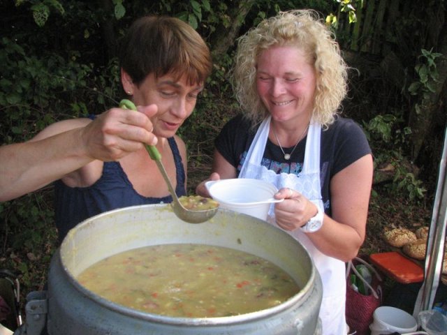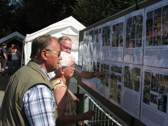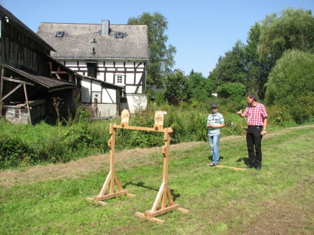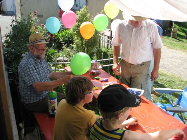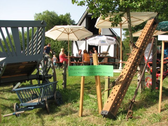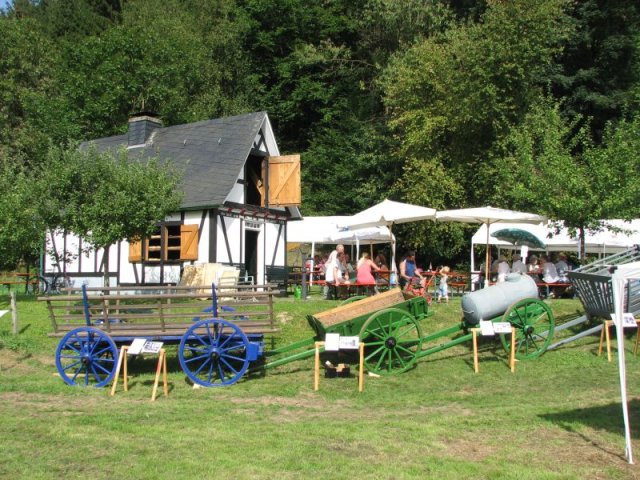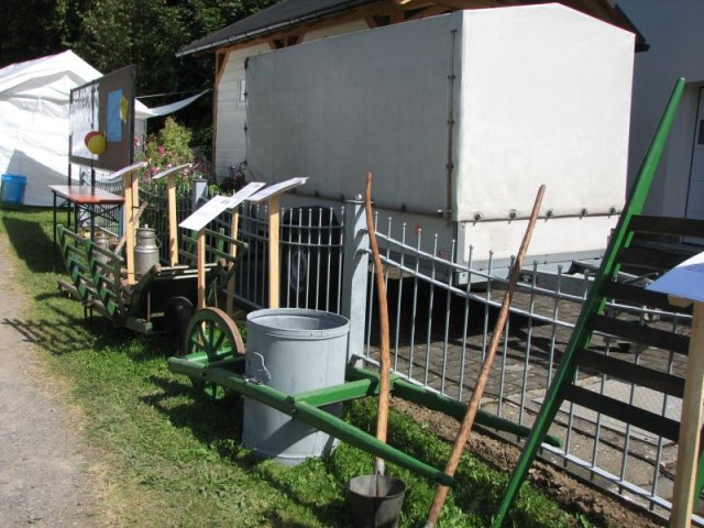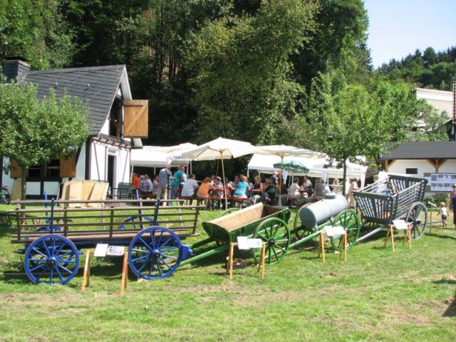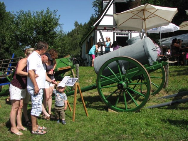 Bei brütender Hitze galt es Bänke und Tische so zu beschatten, dass die Besucher das breite Angebot an herzhaften Speisen, an Kaffee und Kuchen auch wirklich genießen konnten. So prägten Zelte, Sonnenschirme und Sonnensegel das Bild rund um das Backhaus am Zinnwald. Im Blick auf das Rahmenprogramm zum Fest ist der Arbeitskreis Dorferneuerung und Dorfgeschichte um Ideen nicht verlegen: Vor der Kulisse des Backhauses präsentierten sich diesmal landwirtschaftliche Fuhrwerke aus der Zeit vor der Motorisierung. Von der Schubkarre über den Ackerwagen bis hin zur hochrädrigen Kleekarre umfasste die Ausstellung zahlreiche Exponate – allesamt originalgetreu restauriert und betreffend ihren Zweck und ihre Geschichte ausführlich beschrieben. Bei den jüngeren Gästen fand ein Luftballonwettbewerb besonderen Zuspruch – in der Wiese vor dem Backhaus starteten die Mädchen und Jungen ihre Ballons alle zu gleicher Zeit in den völlig wolkenlosen Himmel.