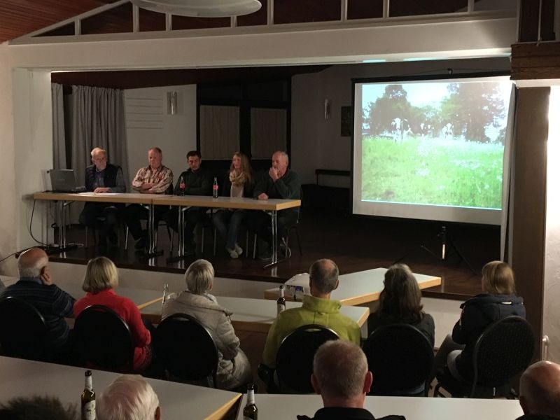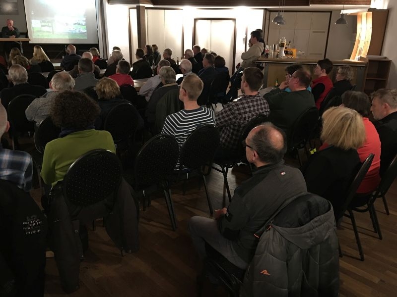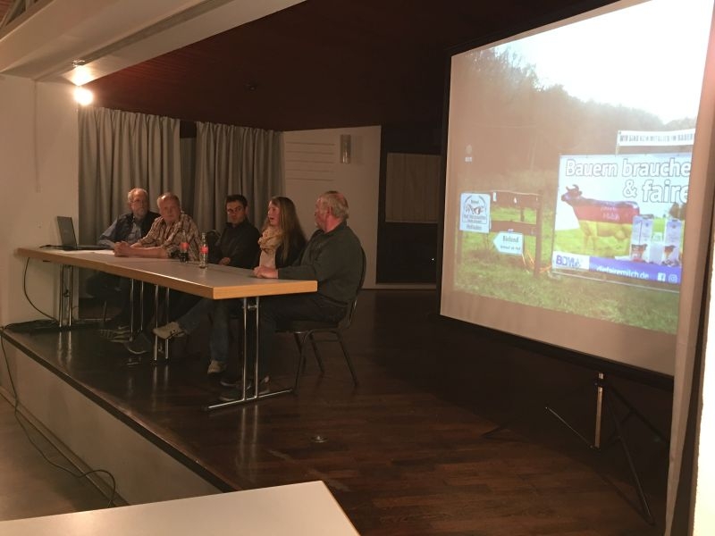 Schon der sehr gute Besuch der Veranstaltung im gefüllten Saal des Dorfgemeinschaftshauses machte deutlich, dass die wirtschaftlichen, ökologischen und gesellschaftspolitischen Bedingungen unter denen Bäuerinnen und Bauern derzeit arbeiten, nicht allein sie selbst, sondern auch die außerlandwirtschaftliche Bevölkerung betreffen. In Wort und Bild beschrieb Ortschronist Ernst-Otto Ohrndorf zunächst die Veränderungen, denen die Landwirtschaft im Dorf während der vergangenen Jahrzehnte unterworfen war: Im Jahr 1950 wurde noch von 64 der insgesamt 80 Familien im Dorf Großvieh gehalten. Seitdem hat sich die Zahl der Haushalte zwar vervielfacht, die  Haltung von Kühen und Rindern findet dagegen nur noch in drei Betrieben statt. Mit dem Rückzug der Landwirtschaft aus den Häusern und „aus den Köpfen der Menschen“ verloren die Bewohner des Dorfes ihre bis dahin größte Gemeinsamkeit: Die Viehhaltung, Aussaat und Ernte hatten ihre Interessen, ihren Alltag und den Jahresablauf maßgeblich bestimmt. Dass die Landwirte im Dorf heute eine Minderheit sind, macht das „Bauer sein“ indes nicht immer einfach – gleichwohl erfüllen sie mit der Erzeugung von Lebensmitteln und der Pflege der Kulturlandschaft eine der wichtigsten Aufgaben in der Gesellschaft überhaupt. Mit Andrea Braach aus „Kiels“, Thilo Mittelbach vom Hof „Alter Berg“, Christian Löw vom „Löwenhof“ und Kurt Ohrndorf  vom „Hof Heckseifen“ waren alle in „Hollekusse“ aktiven landwirtschaftlichen Betriebe im Podium vertreten. Schon die anschauliche Darstellung ihrer Höfe und deren bisheriger Entwicklung, die Beschreibung der Produktionszweige und ihrer jeweiligen Wirtschaftsweise bot den Anwesenden eine Fülle von Informationen, die bisher sicher nicht jedem bekannt waren. Zur Sprache kamen auch die wirtschaftlichen Rahmenbedingungen unter denen die Betriebe zu leiden haben, die nicht zuletzt durch die Politik bewusst geförderten Überschüsse in der Milchproduktion und die damit verbundenen, schon seit langem nicht mehr kostendeckenden Erzeugerpreise für die heimischen Betriebe. Zur Reduzierung von Überschüssen, zum Erreichen einer gerechten Bezahlung der Arbeit auf den Höfen und zur Sicherung einer umweltverträglichen Landwirtschaft führt an einer flächengebundenen Landwirtschaft kein Weg vorbei – darüber bestand bei den Landwirten und im Plenum Einvernehmen. Ausgeführt wurde, dass insbesondere im Blick auf die Umwelt die Wirtschaftsweise der hiesigen Betriebe weitestgehend den gesellschaftlichen Anforderungen entspricht. Gleichwohl leiden gerade unsere Betriebe durch immer neue Auflagen und Vorschriften massiv unter der andernorts betriebenen Wirtschaftsweise, die u. a. für zu hohe Nitratgehalte im Grundwasser verantwortlich ist. Zahlreiche Wortbeiträge befassten sich mit der Frage, wie der Verbraucher durch sein Verhalten die örtliche Höfe unterstützen kann. Zur Sprache kamen dabei die vorhandenen Möglichkeiten des Einkaufs auf den Höfen, ebenso aber die Anregung, im Einzelhandel bewusst auf weitgehend aus der Region stammende Erzeugnisse zuzugreifen – im Bereich der Milchprodukte auf solche der Marken Tuffi und Landliebe sowie der Upländer Bauernmolkerei. Eine Anfrage im Publikum bewies, dass viele der Anwesenden diesen Weg bereits beschreiten. Dass sich durch veränderte landwirtschaftliche Strukturen auch das Bild der Landschaft verändert, ist unabdingbar: Eine dörfliche Flur, in der nur noch wenige mit immer größeren Maschine tätig sind, sieht anders aus als eine Flur, mit deren Pflege vor 50 Jahren rund 250 Menschen beschäftigt waren. Und auch mit dem zeitweisen Geruch nach Gülle tat sich niemand schwer: „Das gehört zum Land, da weiß ich eben, dass ich noch lebe …“ – so ein Gesprächsteilnehmer. Dass bestimmte andere Zeitgenossen  in Sachen „Respekt vor dem Eigentum anderer“ dringend „Nachhilfeunterricht“ brauchen – z. B. was das Betreten und Befahren von Wiesen betrifft – auch darin bestand zwischen den Landwirten und dem Publikum vollkommene Einigkeit.