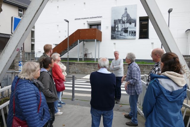 Am 17. Okt.2024 besuchten Mitglieder des Arbeitskreises das Aktiven Museum Südwestfalen in Siegen. Das Museum befindet sich in einem 1940 erbauten Luftschutzbunker, der auf den Grundmauern der am 10. November 1938 mutwillig niedergebrannten Synagoge, errichtet wurde. Sie erfuhren dabei viel Interessantes und zugleich Erschütterndes über die Geschichte der jüdischen Gemeinde im Siegerland und über den Bau und den Brand der Siegener Synagoge, deren neu entstandenes Modell besichtigt werden konnte.