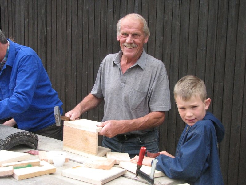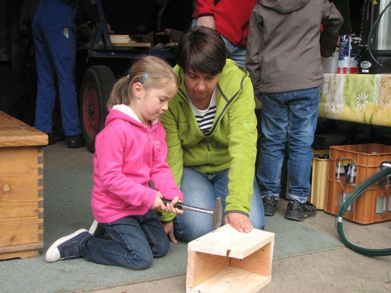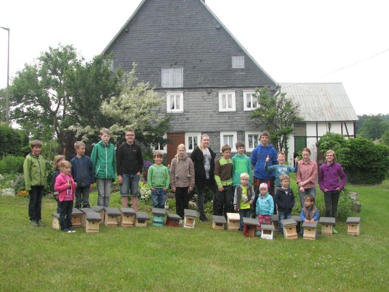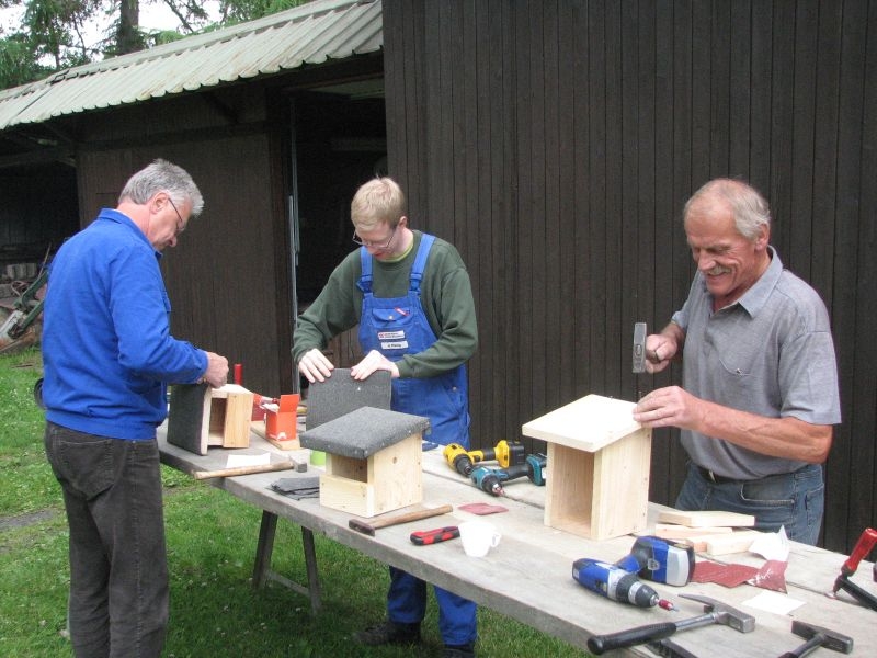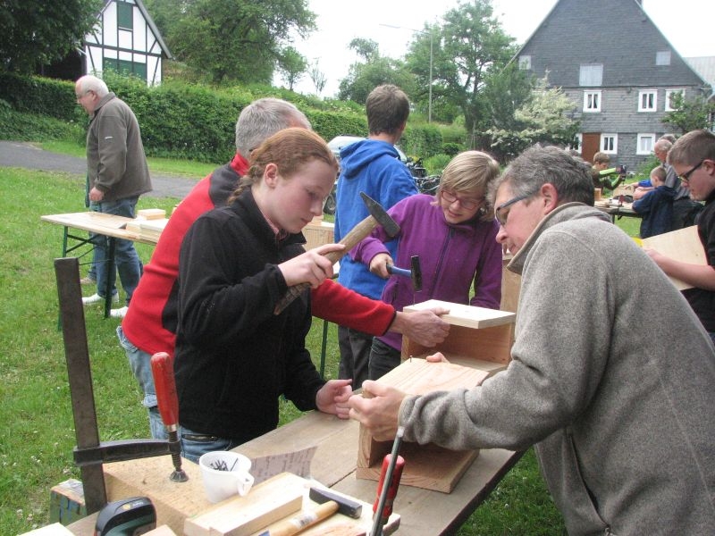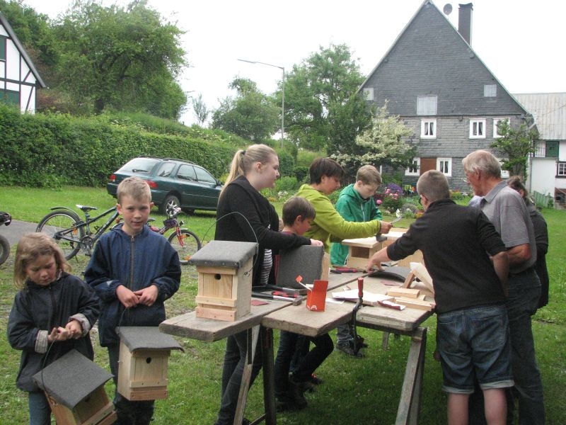Vor „Gisselersch“-Scheune fanden sich am vergangenen Samstag zwanzig Kinder des Dorfes zusammen, um unter fachkundiger Anleitung Nistkästen für Vögel zu bauen. Eingeladen hierzu hatte der Arbeitskreis Dorferneuerung und Dorfgeschichte, von dessen Mitgliedern auch das Baumaterial zusammengestellt und vorbereitet worden war. Nach einigen Hinweisen zum Bau der Kästen und mit „handwerklichen Tipps“ versehen machten sich die Mädchen und Jungen mit Eifer an die Arbeit. Schon nach kurzer Zeit übertönte der Klang der Hämmer jedes Gespräch. Wenn auch beim Zusammennageln der Bretter der eine oder andere Nagel mal krumm wurde, im Umgang mit Hammer, Zange oder dem Akkuschrauber bewiesen die jungen Naturfreunde viel Geschick und Ausdauer. Unterstützt von einem Erwachsenen oder auch ganz allein von Kinderhand entstanden insgesamt 30 Nistkästen, die meisten davon für „Höhlenbrüter“ wie die Kohlmeise, aber auch für Vogelarten, die einem halb offenen Nistkasten den Vorzug geben, wie die Bachstelze, das Rotkehlchen oder der Zaunkönig. Geeignete Standorte für die neuen Nistkästen werden sich in den Gärten, Obstwiesen oder am Waldrand leicht finden lassen.