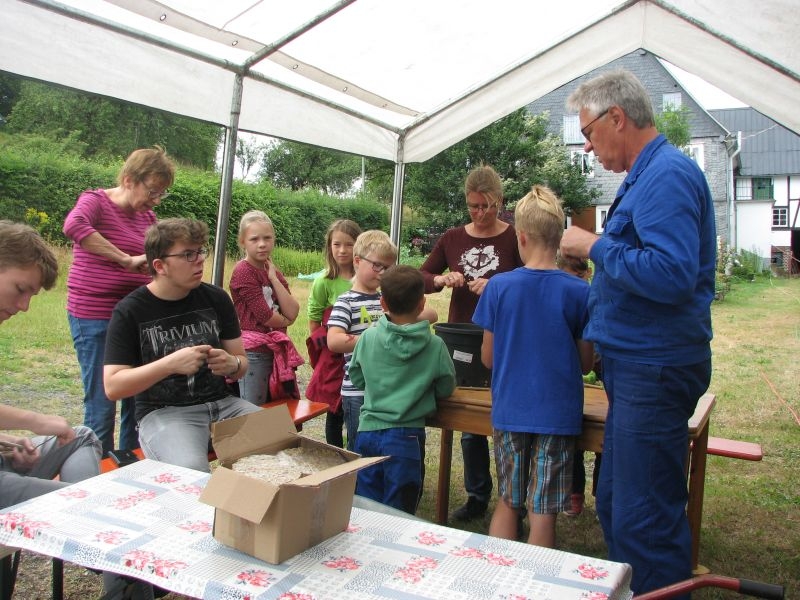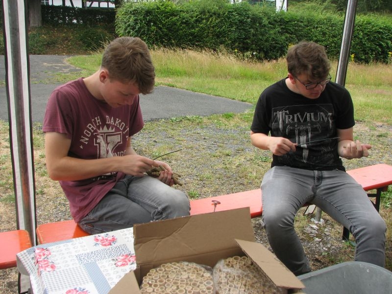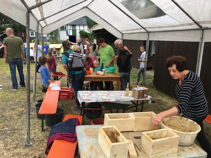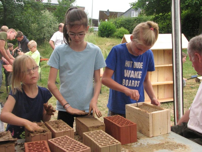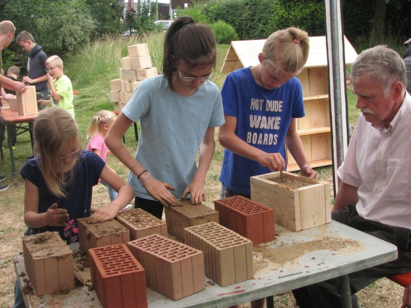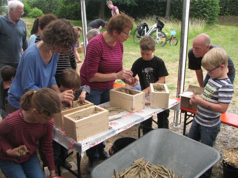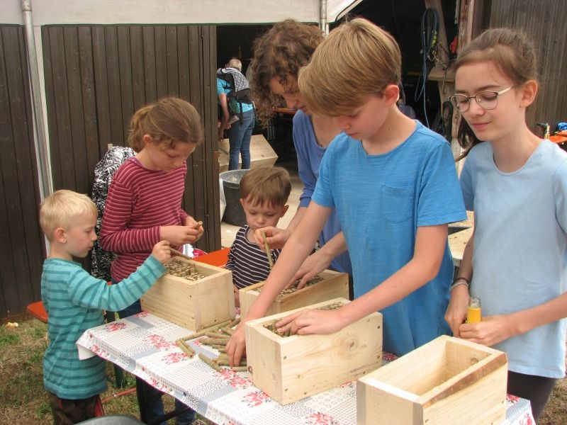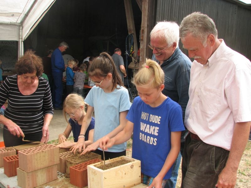 Im Jahresproramm des Arbeitskreises hat eine „Aktion für Kinder“ mit ökologischen, künstlerischen oder heimatkundlichen Themen ihren festen Platz: „Für Wildbienen und andere Insekten eine passende Unterkunft zu schaffen …“ – dieser Aufgabe widmeten sich am 13. Juli 2019 auf Einladung des Arbeitskreises 25 Mädchen und Jungen in und vor „Gisselersch“-Scheune. Aus abgelagerten Holzblöcken, aus Gitterziegeln, mit Lehmmischungen, Ton und Pflanzenstengeln stellten die Kinder zahlreiche, jeweils in einem Holzrahmen untergebrachte Nisthilfen her.