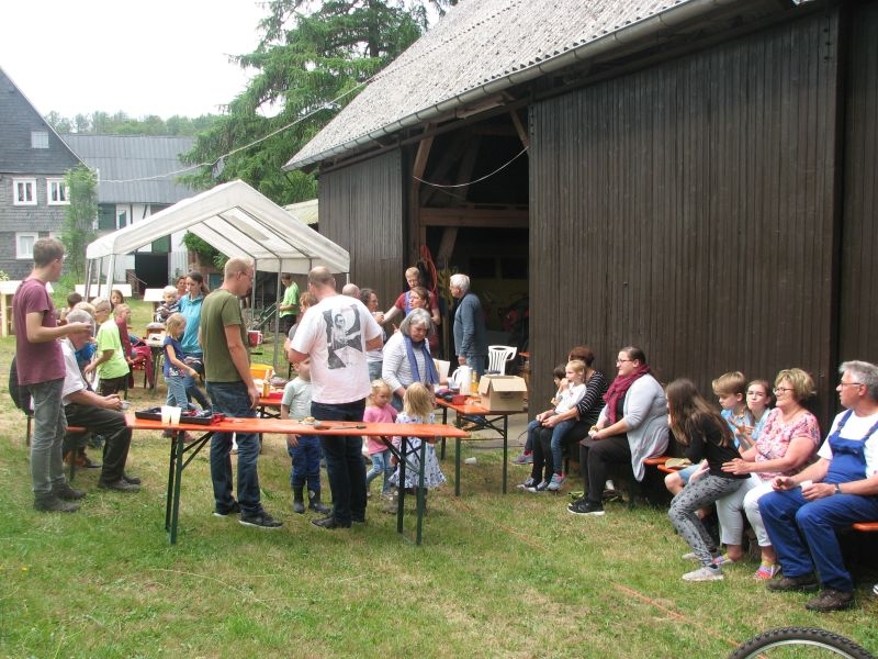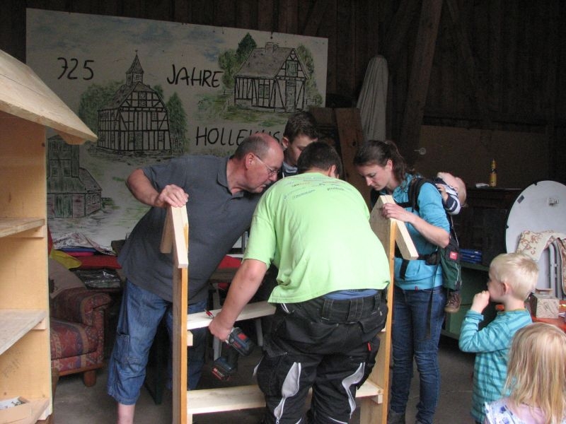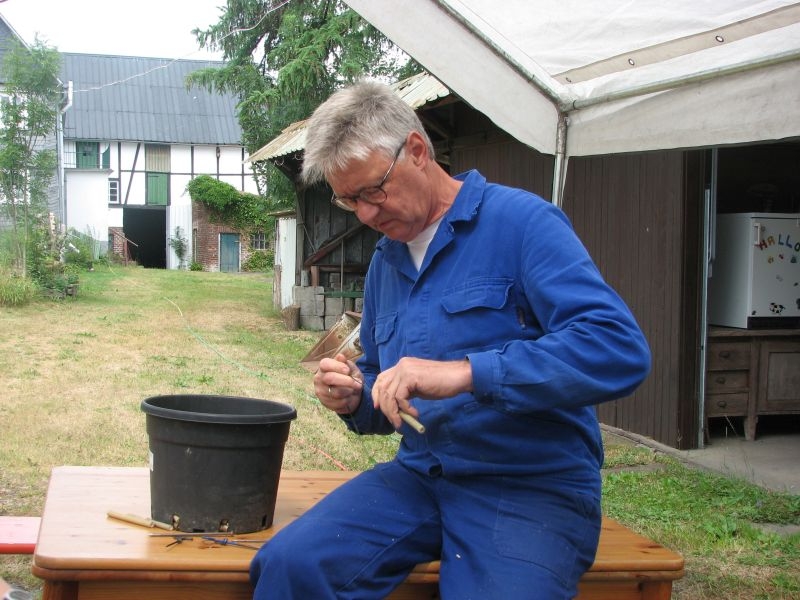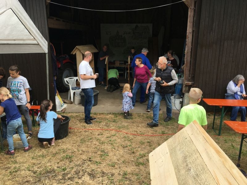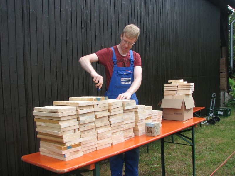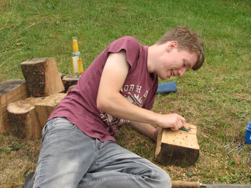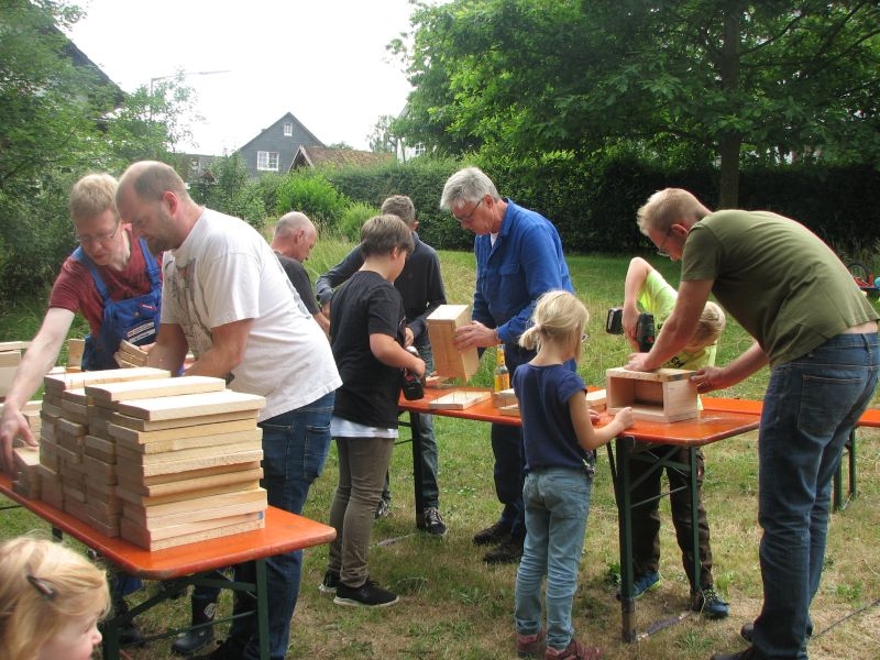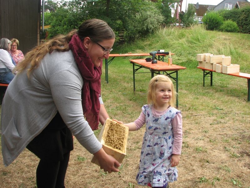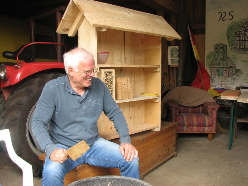Im Jahresproramm des Arbeitskreises hat eine „Aktion für Kinder“ mit ökologischen, künstlerischen oder heimatkundlichen Themen ihren festen Platz: „Für Wildbienen und andere Insekten eine passende Unterkunft zu schaffen …“ – dieser Aufgabe widmeten sich am 13. Juli 2019 auf Einladung des Arbeitskreises 25 Mädchen und Jungen in und vor „Gisselersch“-Scheune. Aus abgelagerten Holzblöcken, aus Gitterziegeln, mit Lehmmischungen, Ton und Pflanzenstengeln stellten die Kinder zahlreiche, jeweils in einem Holzrahmen untergebrachte Nisthilfen her.