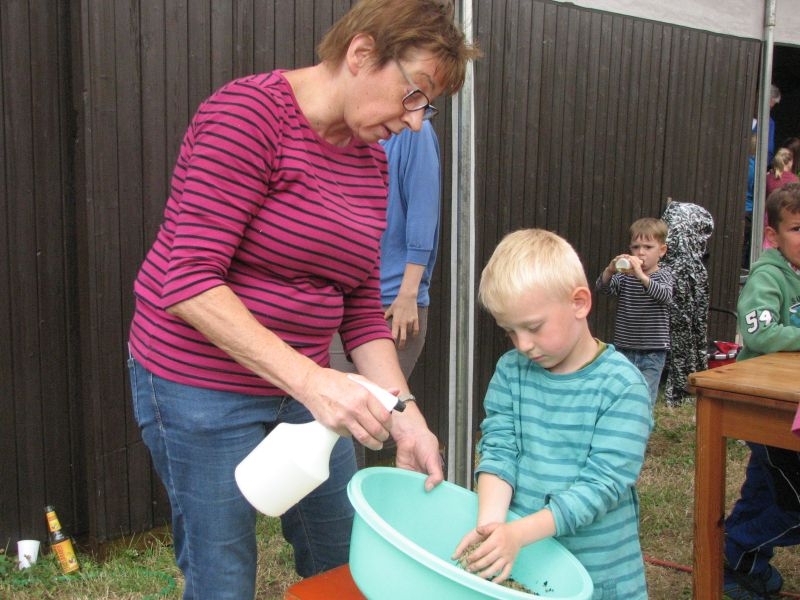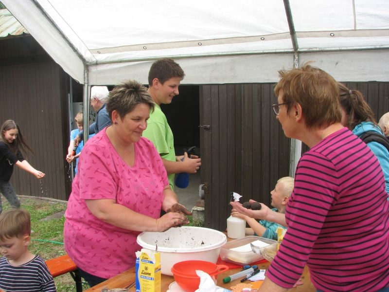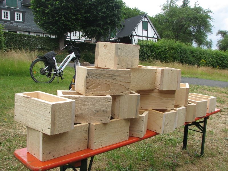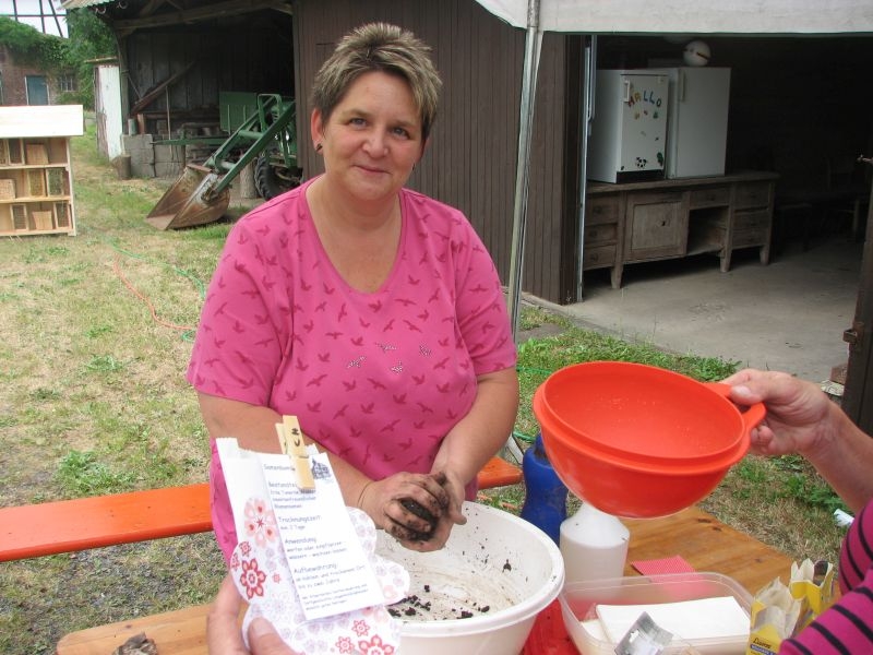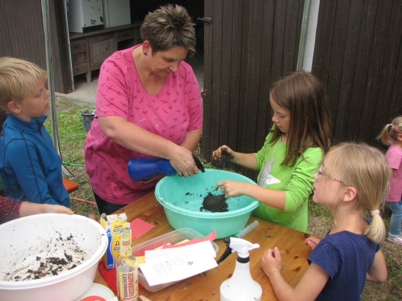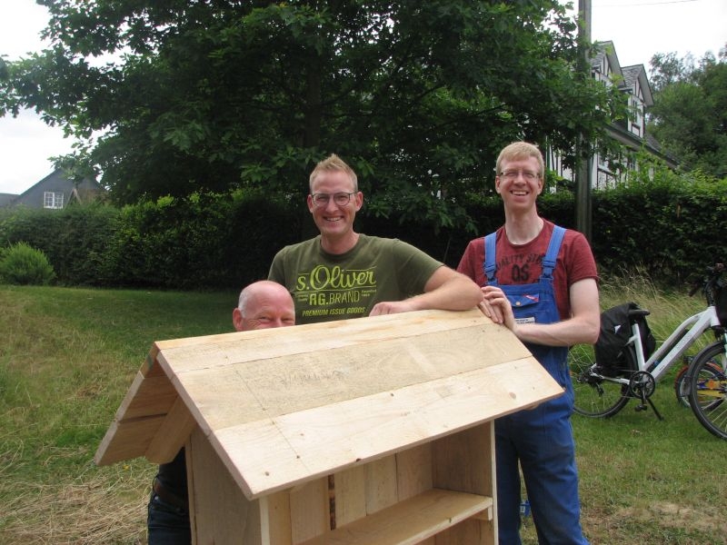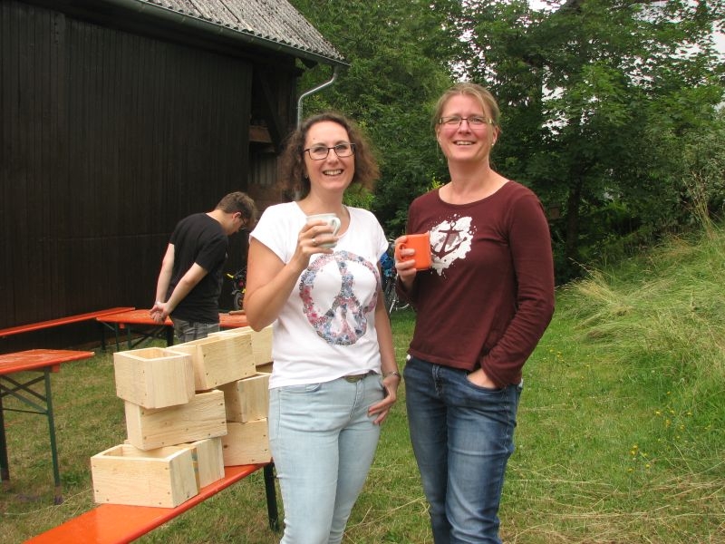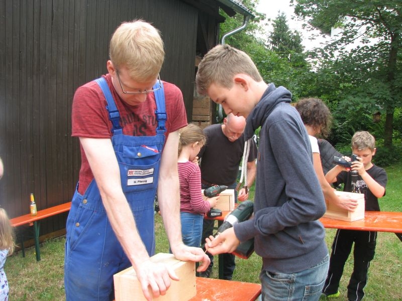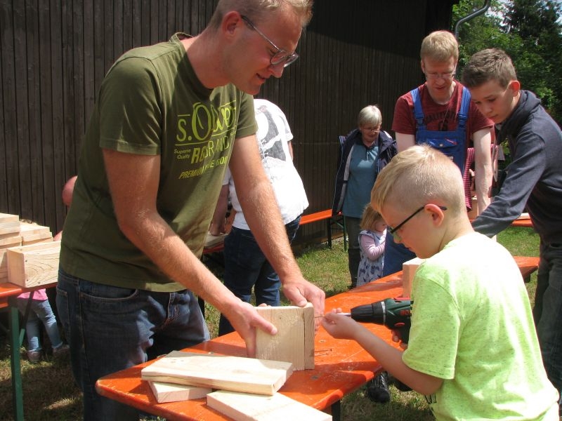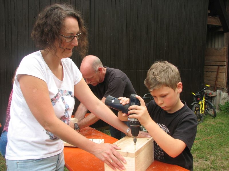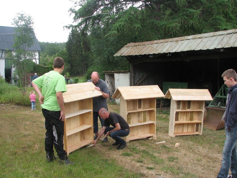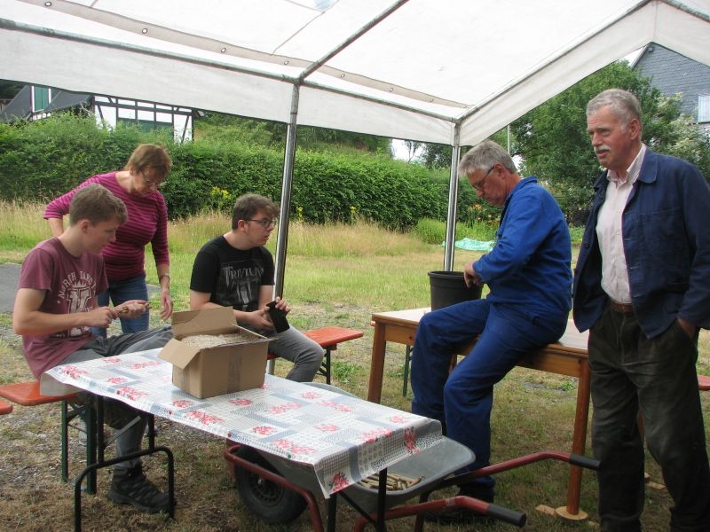 Die so entstandenen „Wohneinheiten“ wiederum fanden Platz in den „Etagen“ größerer „Insektenhotels“, die ebenso wie die Holzrahmen von den Kindern selbst zusammengebaut wurden. Ob beim Arbeiten mit dem Akkuschrauber, dem Aufbohren und Einsetzen von Pflanzenstengeln, dem Entgraten von Einflugöffnungen oder dem Umgang mit Lehm und Ton – überall bewiesen die jungen Helfer nicht nur viel Geschick, sondern auch Begeisterung und die nötige Ausdauer. Dass die Kinder ihre „Arbeitsstelle“ dabei selbst auswählen und diese auch nach Wunsch wechseln konnten, kam den verschiedenen Begabungen und Interessen, aber auch der tollen Arbeitsatmosphäre sehr zugute. Die für die Insektenhotels notwendigen Baumaterialien waren in den Tagen zuvor beschafft und vorbereitet worden. Bei der Anleitung der jungen Handwerker wurden die Mitglieder des Arbeitskreises von etlichen Eltern und Großeltern der Kinder bestens unterstützt. Um auch das Futterangebot an Blühpflanzen für Schmetterlinge und Insekten zu verbessern, fertigten die Teilnehmer der Aktion unter fachkundiger Anleitung zudem zahlreiche „Samenbomben“ an, die ihre „Wirkung“ an geeigneter Stelle hoffentlich entfalten werden. Ein gemeinsames Kaffeetrinken von Jung und Alt belohnte am Schluss für die erbrachte Mühe zum Erhalt einer intakten Umwelt. Noch mit einer Dacheindeckung und einem Drahtgeflecht zum Schutz der Insekten versehen werden die Hotels demnächst an verschiedenen Orten in Dorfnähe aufgestellt. Dort können die Mädchen und Jungen ihr Werk jederzeit besuchen und den Erfolg ihrer Arbeit beobachten.