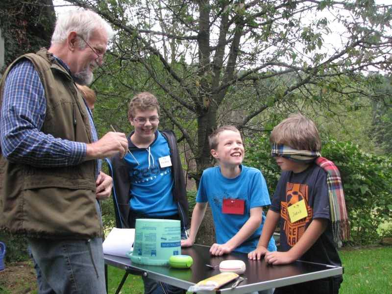 Wieviel PS und wie viele Schaufeln hat das Wasserrad? In welche Himmelsrichtung blickt der Hahn auf dem neuen Glockenturm wenn er ins „Unterdorf“ schaut ? Wo wohnte dereinst der „Bienenvater Spies“ und welches Tier ziert die Eingangstür zur alten Schmiede? Dies und vieles mehr galt es heraus zu finden. An „Gieselersch Scheune“, dem Zielpunkt der „Rallye“, ging es dann weniger um dörfliche Geschichte als vielmehr um die Kenntnisse der Kinder von der Natur und ihre Fähigkeit, die eigenen Sinne zielgerichtet einzusetzen: Ob nun bei der Zuordnung von Blättern zum richtigen Baum, der Identifizierung unterschiedlichster Getreidearten oder beim Fühlen , Riechen oder Schmecken – mit Bravour wurden auch diese Aufgaben gelöst. Den gemeinsamen Abschluss bei frisch gebackenen Waffeln hatten sich alle Teilnehmer somit redlich verdient!