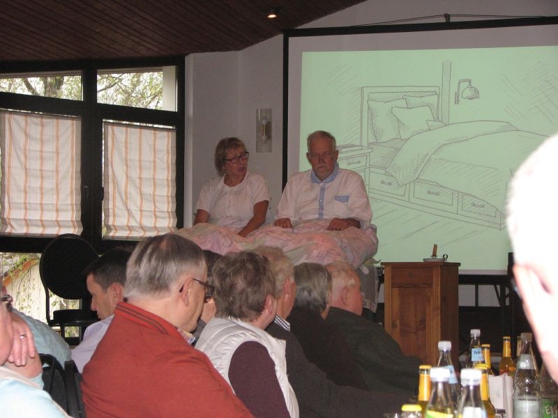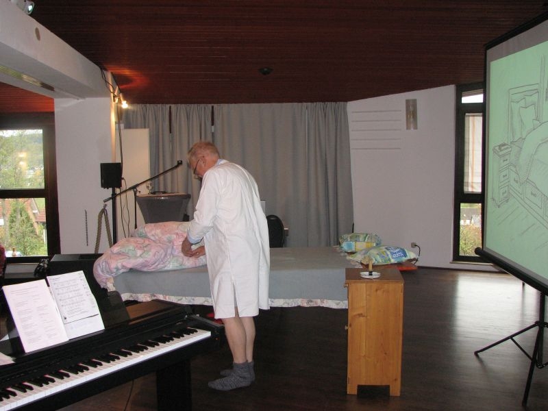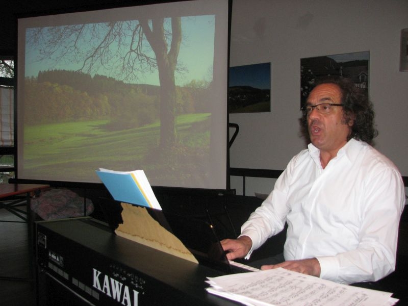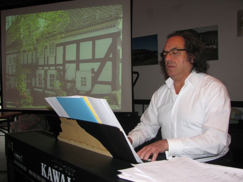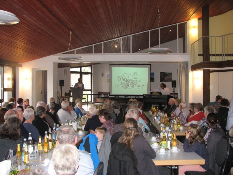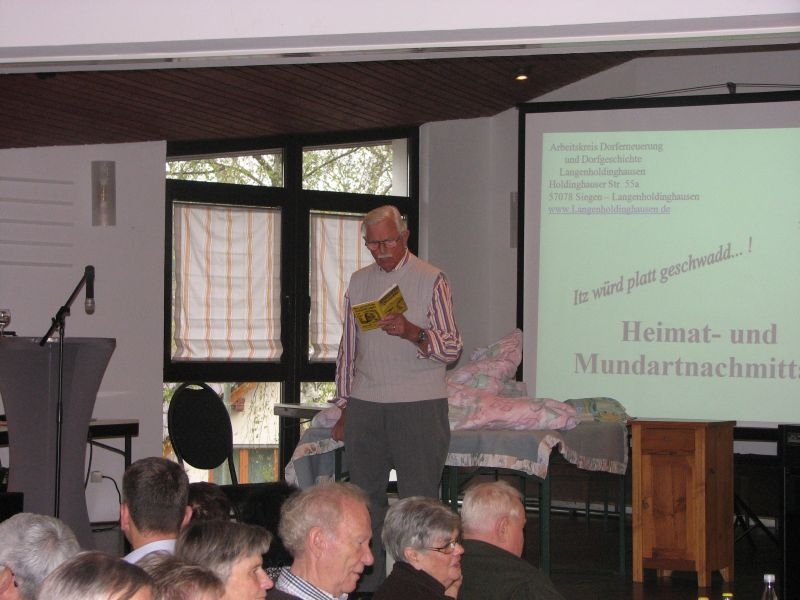 Das anschließende Programm widmete sich im Wechsel dem Ort „Hollekusse“ und der Mundart - in Wort und Bild sowie mittels der Musik. Den Anfang machte eine auf dem Klavier begleitete Bilderreise durch Langenholdinghausen und die Jahreszeiten, eine Reise, die den Zuschauern einmal mehr die Schönheit und die Besonderheiten des Dorfes vor Augen führte. Zu einer leidenschaftlichen Werbung für den Erhalt des örtlichen Brauchtums – des „Maikinds“, des „Pengsdelömmels“ und des „Nikolausgehens“ – geriet ein Vortrag, bei dem zunächst das Wissen des Publikums um diese Bräuche und dessen aktuelle Mitwirkung  daran abgefragt wurden. Guter Ortskenntnisse und der Aufmerksamkeit  bei Spaziergängen im Dorf bedurfte es bei  einer Reihe von „Bilderrätseln“. Dabei setzten sich vor den Augen der Gäste auf der Leinwand einzelne Bildteile erst ganz allmählich zu einem Gesamtbild zusammen. Währenddessen war das zentrale Motiv der Aufnahmen – ein bestimmter Straßenzug, ein Gebäudegruppe  oder eine bestimmte Sehenswürdigkeit - schnellstmöglich zu bestimmen. Der Sketch „Bettgeflüster“ amüsierte die Zuschauer zum einen durch sein Lokalkolorit, zum anderen aber auch durch die von Annemarie Gieseler eingebrachte Situationskomik. Vorgetragen wurde der Sketch natürlich in „Sejjerlänner Platt“. Die Geschichte dieser Mundart „als ganz besonderes Stück Heimat“ wurde im Verlaufe der Veranstaltung ebenso angesprochen wie ihre Bedeutung für die Verbundenheit der Menschen vor Ort, deren Identität und die kulturelle Vielfalt. Daran, dass in den Jahren nach 1945 im Dorf auch ein anderer, für die Siegerländer ganz ungewohnter Dialekt zu hören war, erinnerte ein Gedichtvortrag von Ernst Drescher in schlesischer Mundart. Er selbst war damals als Ostvertriebener ins Dorf gekommen. Ein gemeinsames Lied, in dessen Text sich Geschichte und „heimatstiftende Merkmale“ von Langenholdinghausen stimmungsvoll widerspiegelten, leitete über zu angeregten Gesprächen bei Kaffee und selbstgebackenem Kuchen. Eine besondere Bereicherung erfuhr der Heimat-- und Mundartnachmittags durch die Mitwirkung des Pianisten und Komponisten Sergio del Rio aus Langenholdinghausen, der die gesamte Veranstaltung musikalisch begleitete.