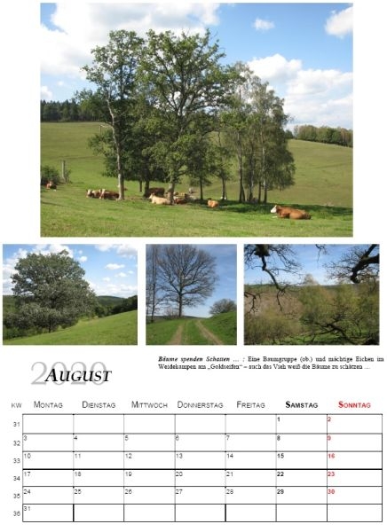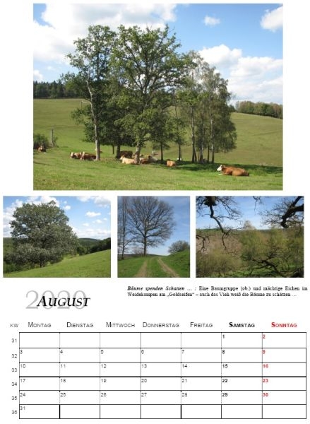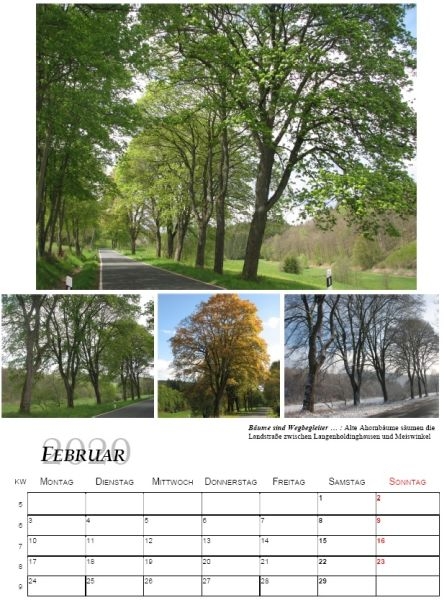 zu einem Jahreskalender für das Jahr 2020 zusammen. Die einzelnen Monatsseiten zeigen dabei dasselbe Motiv zu verschiedenen Jahreszeiten oder aber verschiedene Motive, die im Dorf räumlich nah beieinander liegen. Nicht allein bei den am Dorf interessierten Ortsansässigen, sondern auch bei auswärtigen Naturliebhabern stieß der Kalender im Format A3 auf ein reges Interesse. 110 Exemplare des qualitativ hochwertigen Kalenders konnten aufgelegt und am 7. Dez. 2019 bei „Schusdersch“ und „Roenstatts“ an die zufriedenen Besteller ausgegeben werden.