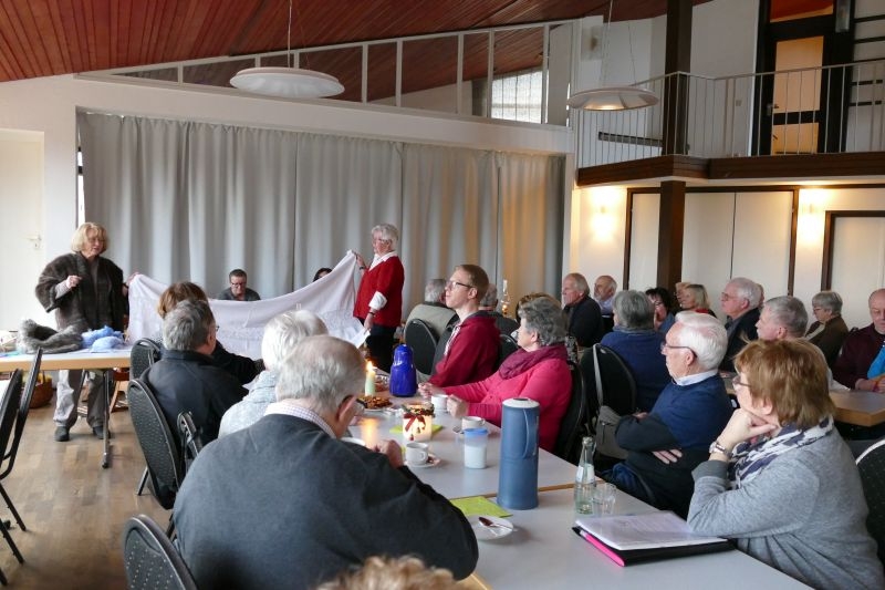im Dorfgemeinschaftshaus am Altenberg am Sonntag, dem 26. Januar 2020. Gut 40 Gäste – jung und alt – folgten der Einladung und saßen bei Kaffee, Tee, Kuchen und Kerzenschein beieinander , um sich die Anekdoten und Erzählungen der anderen anzuhören. Diese wurden teilweise auf Siegerländer Platt zum Besten gegeben, was allerdings auch schon mal zu Fragezeichen in den Gesichtern derjenigen führte, die des „Plattdeutschen“ nicht ganz mächtig waren. Zum Glück aber saßen jede Menge „Dolmetscher“ im Raum. Da ging es um Geschichten aus der Zeit der Großväter und Urgroßväter, der Großtanten und Urgroßtanten. Um deren Essgewohnheiten, um Sitten und Bräuche, um Verbindungen des Dorfes in die Ferne in früherer Zeit, kurzum: Um eine kulturelle Erlebnisreise in die Vergangenheit. Fünf Frauen hatten ihr Spinnrad mit zur „Lechdschdonn“ gebracht und zeigten den Besuchern, wie durch Zieh- und Drehtechniken aus loser Wolle ein Faden gesponnen werden kann. Von Webmeisterin Inge Zöller erfuhr das interessierte Publikum, welch großen Stellenwert das Spinnen und Weben früher im Leben der Menschen innehatte, wie und warum sich das Spinnen in zahlreichen Märchen niederschlug und wie viele Redewendungen und Begriffe in der Tätigkeit des Spinnens und Webens ihren Ursprung haben. „Den Bogen raus haben …“, „den Faden verlieren“, „überdreht sein …“, „sich etwas zurecht spinnen …“ – all diese Aussagen lassen sich auf das Spinnen und Weben zurück führen. So geriet die „Lechdschdonn“ zu einer entspannten und zwanglosen Zusammenkunft, die womöglich im nächsten Jahr erneut angeboten wird.