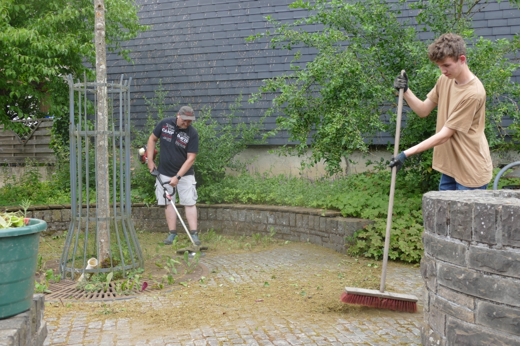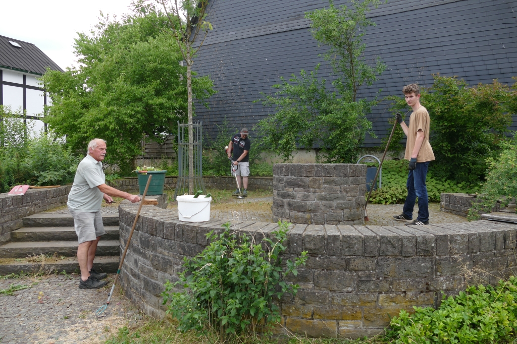 Und immer wieder gilt es "praktisch anzupacken": Im Juni 2023 brachten Helfer des Arbeitskreises die Sitzecke bei "Hürschdersch" weitgehend in Ordnung, es wurde gemäht, das Unkraut bekämpft, das Pflaster mit dem Trimmer und angebauter Drahtbürste gereinigt, gefegt und am Apfelbaum ein gebrochener Ast abgenommen.