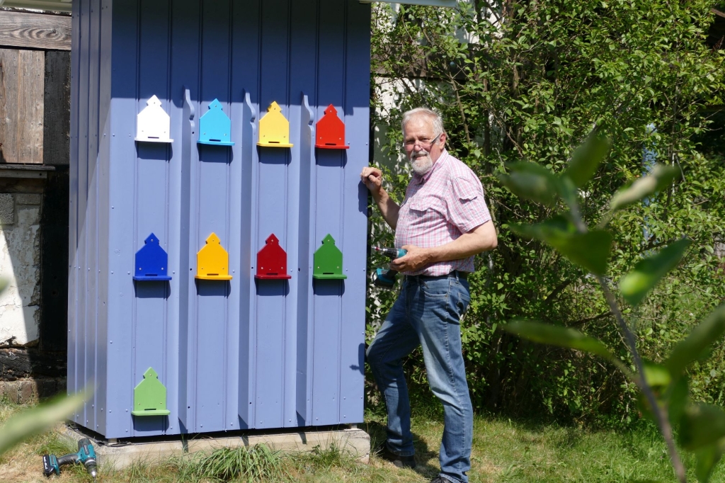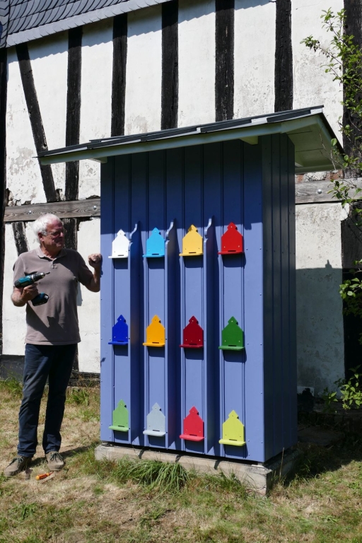 Es handelt sich dabei um eine von unserer Gruppe sehr aufwändig und detailgetreu ausgeführte Rekonstruktion eines Bienenstandes aus der Zeit um 1900, der zuvor am selben Platz stand, aber nicht mehr zu renovieren war und der seitdem in Roenstatts Obstwiese seinen Altersruhesitz hat. Da der bunte Anstrich des rekonstruierten Standes mittlerweile in die Jahre gekommen war und unter der Witterung gelitten hatte, wurde am 7. und 8. August 2020 der hölzerne Bienenstand abgeschliffen, komplett neu lackiert,und auch die zwölf markant bunten Einflugsöffnungen für die Bienen erhielten frische Farbe. Dieses einmalige Zeugnis aus der Geschichte der heimischen Imkerei ist ein historisches Kleinod des Dorfes. Als Blickfang im Ortsbild ist es der Bienenstand allemal wert, von der Straße oder vom nahegelegenen Spritzenhaus aus, näher in Augenschein genommen zu werden.