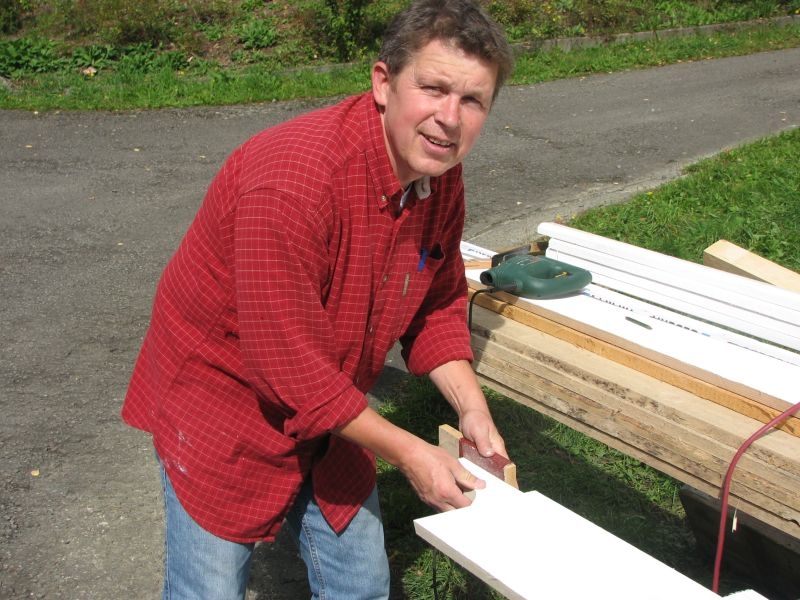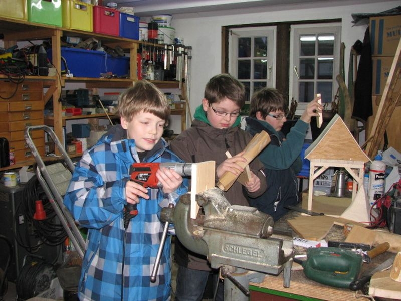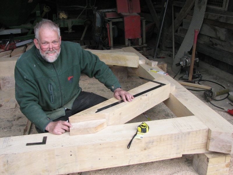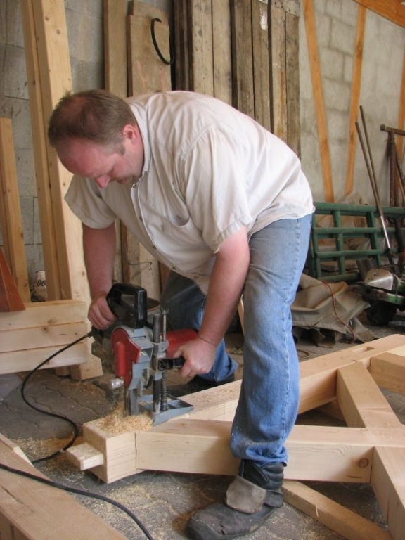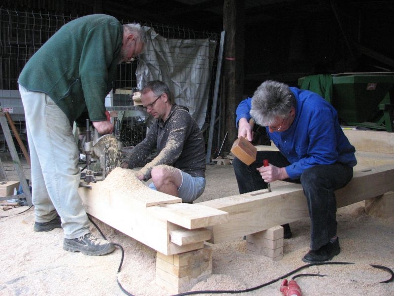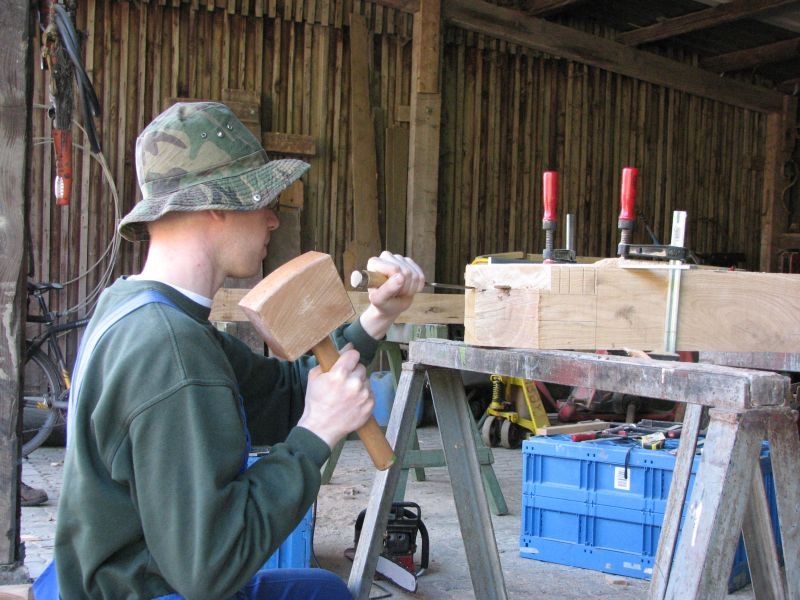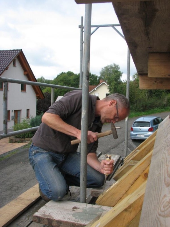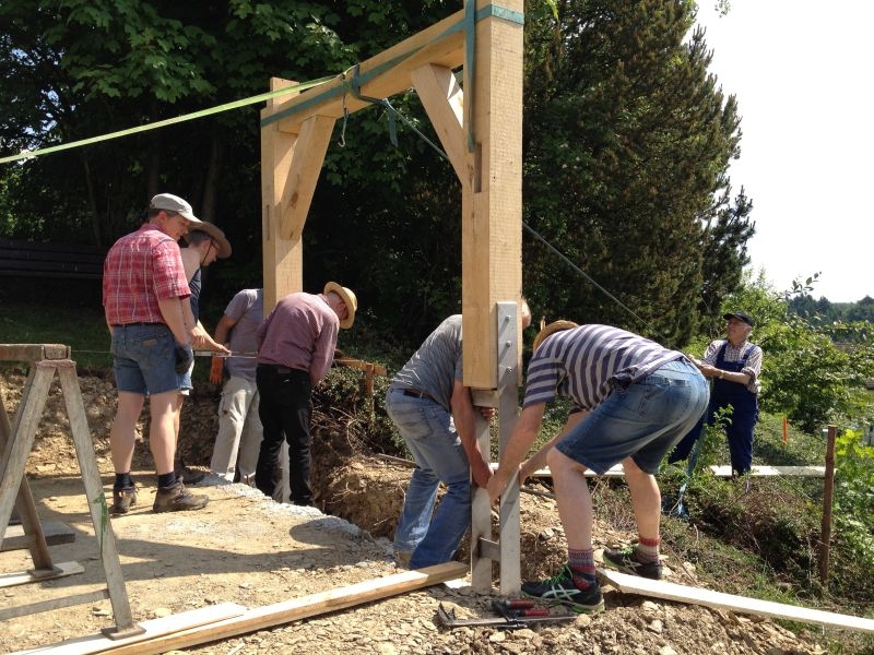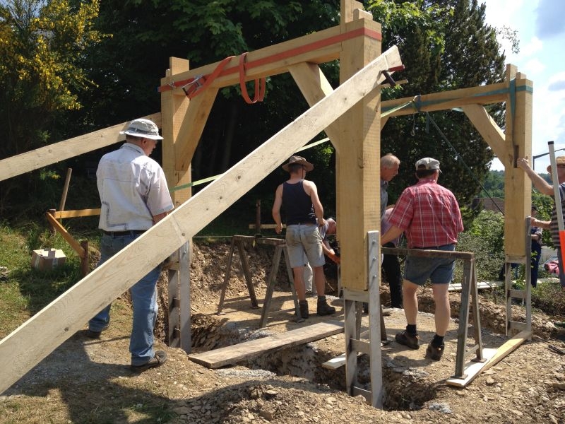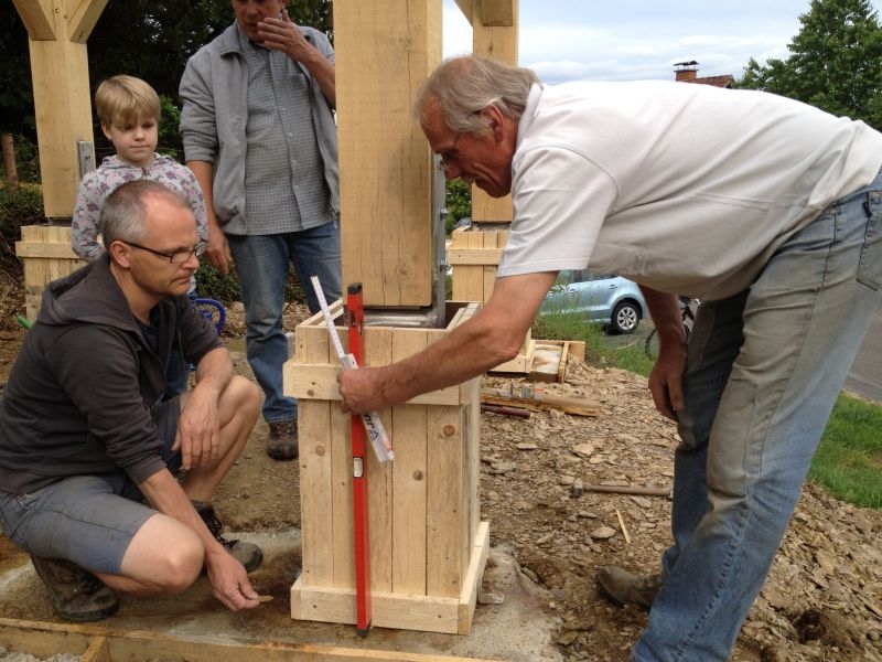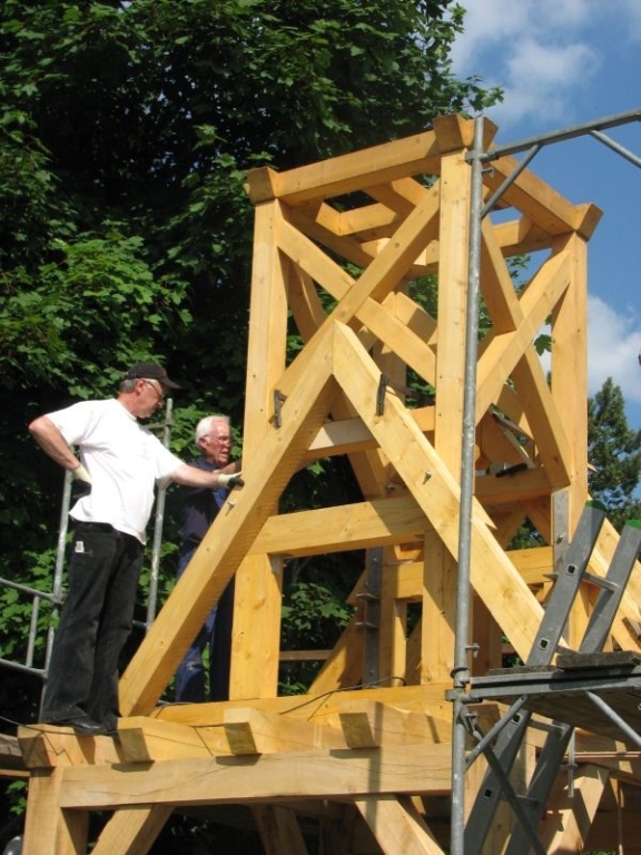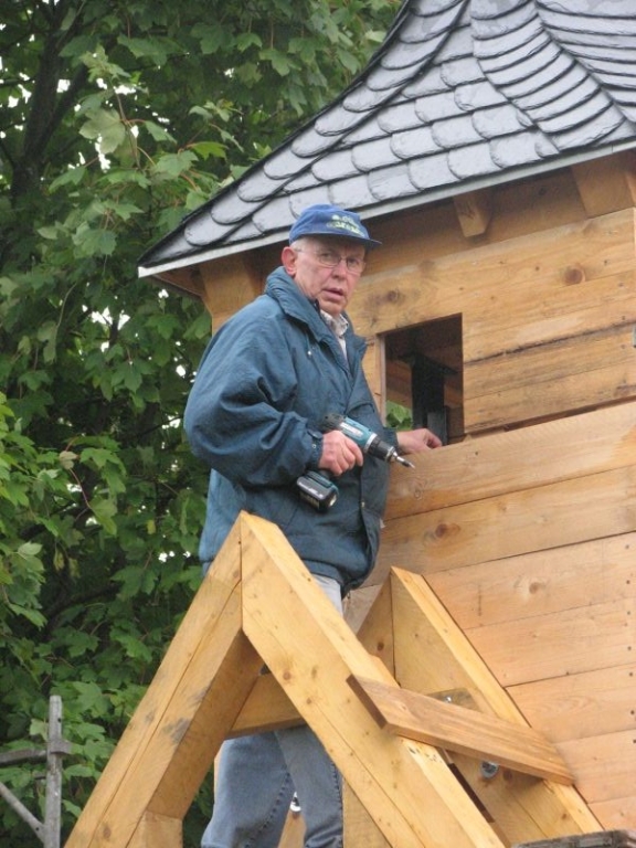 Am 11. April begannen mit dem Fällen mehrerer Eichen am "Goldseifen" die praktischen Arbeiten zur Realisierung des Objektes. Der Bau des Turmes beschäftigte uns von April bis in den November 2013. Fast alle notwendigen Arbeiten wurden von den Mitgliedern unserer Gruppe selbst ausgeführt - von der Planung bis zum letzten Pinselstrich. Mehr als 1020 Arbeitsstunden investierten die Helfer in ihr „Turmprojekt“. Jeder trug nach seinen Möglichkeiten zum Gelingen des Vorhabens bei. Die für das Ständerwerk erforderlichen Eichen wurden vor Ort gefällt, mit dem Mobilsägewerk zu Balken geschnitten und gemeinsam verzimmert. Lediglich die Eindeckung des Daches und des Dachreiters mit Naturschiefer blieb dem erfahrenen Fachmann vorbehalten. Und mit dieser Arbeit vollbrachte der 71jährige Dachdeckermeister Willi Loos erneut ein Meisterstück. Das Ziel, ein Zeugnis traditioneller handwerklicher Baukunst und einen „Blickfang“ im Ortsbild zu schaffen, wurde durch die Arbeiten einmal mehr erreicht. Die abschließende Gestaltung und Eingrünung des Turmumfeldes erfolgt im Frühjahr 2014.