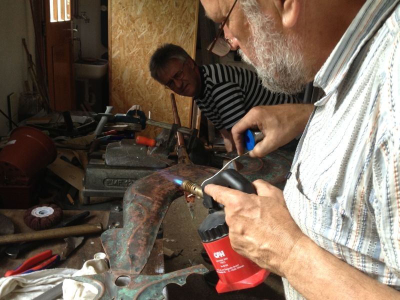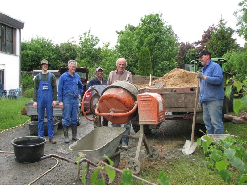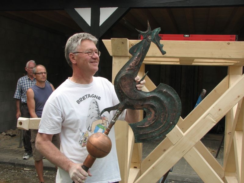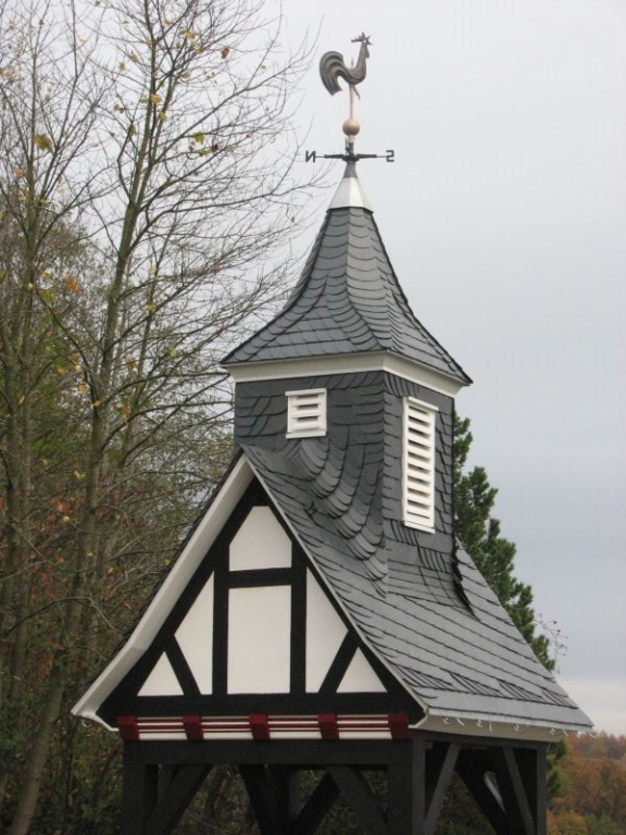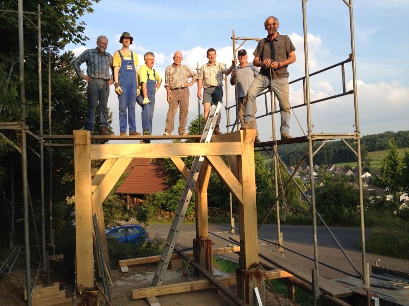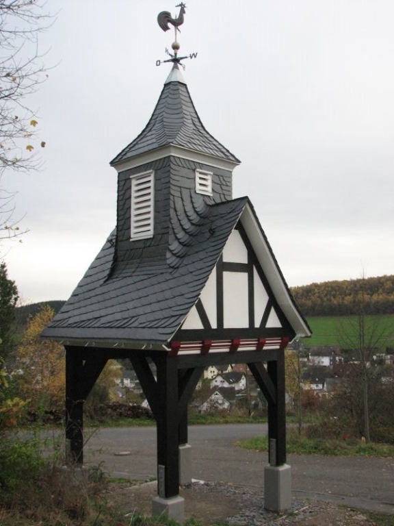 Am Anfang des Projektes stand eine insbesondere von unserem Mitstreiter Kurt Pfennig favorisierte Idee: Der Glockenturm der einstigen Schulkapelle sollte neu entstehen und einer - zunächst noch nicht feststehenden - Verwendung zugeführt werden. Im Sommer 2010 wurde deshalb mit der Materialbeschaffung und schon bald darauf mit den Bauarbeiten bei "Roenstatts" begonnen. Am 22. Aug. 2010 konnte das Turmgerüst mit dem als Original erhalten gebliebenen kupfernen Hahn und einer Glocke - einem Zufallsfund - während des "Backesfestes" erstmals der Öffentlichkeit präsentiert werden. Im Rahmen des am 18.und 19. September 2010 in Siegen stattfindenden NRW-Tages mit etwa 400 000 Besuchern aus nah und fern bildete das Turmgerüst mit Glocke und Hahn den idealen Blickfang für unseren stark frequentierten Stand zum Thema "Dorferneuerung - Der Heimat eine Zukunft geben". Im Jahr darauf kam das Turmgerüst ein weiteres Mal zum Einsatz - diesmal während des Ortsjubiläums von Bürbach. Gerne waren wir der Bitte der dortigen Heimatfreunde gefolgt, ihr Fest am 1. / 2. Okt. 2011 mit unserem Glockenturm zu bereichern. Danach wurde der Turm erneut demontiert und in "Schusdersch"-Scheune zwischengelagert. Der anfänglich gehegte Wunsch, den Dachreiter wieder auf das Dach der einstigen Kapellenschule zu setzen, hatte sich nach Gesprächen mit dem Besitzer des Anwesens zwar zerschlagen, aber der Gedanke an eine weitere Verwendung des Turmes, einen möglichen neuen Standort und die Gestaltung eines solchen Objektes ließ unseren Arbeitskreis nicht ruhen: Nach vielen Überlegungen und Diskussionen, Nachfragen und zahlreichen Gesprächen mit Grundeigentümern und Behörden konnten wir im am 25. März 2013 den Bauantrag für den Glockenturm bei der Stadt Siegen einreichen. Parallel hierzu waren die Bürger und Vereine vor Ort umfassend über das Vorhaben informiert worden, wobei sich keinerlei Einwendungen ergaben.