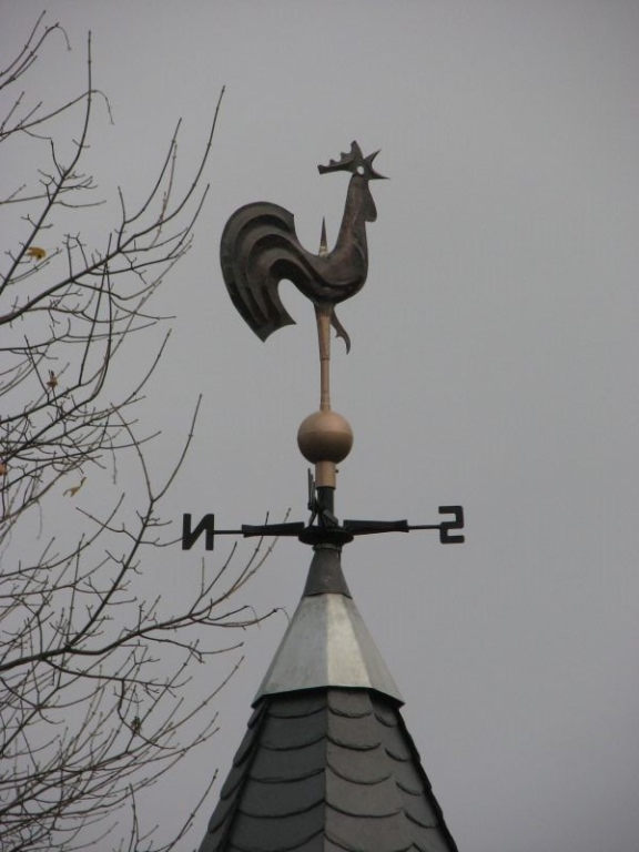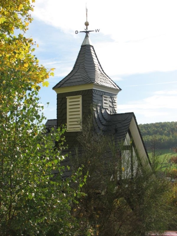 Fast 270 Jahre lang zierte ein Glockenstuhl als „Dachreiter“ das einstige Schul- und Gotteshaus. Nachdem bereits im Kriegsjahr 1941 die Glocke aus dem Turm entfernt und zu Kriegszwecken eingeschmolzen worden war, fiel im Sommer 1950 das mittlerweile wohl auch baufällig gewordene Glockentürmchen Axt und Säge zum Opfer.Vom Wetterhahn, der die Turmspitze bis dahin zierte, ist lediglich bekannt, dass er im Frühjahr 1932 „von einem Windstoß herabgeworfen und die Turmspitze beschädigt“ worden war. Die Turmspitze wurde repariert und vermutlich auch der aus Kupferblech gefertigte Hahn wieder auf der Turmspitze angebracht. Nach Abbruch des Turmes blieb er indes verschwunden. Erst in den 1960er Jahren entdeckte Kurt Pfennig den Hahn durch Zufall im Bett des Holzklaubaches. Wie er dort hingelangt war, wird wohl immer ein Geheimnis bleiben. Mit einem neuen Anstrich versehen wurde der Hahn später auf dem Dach des Schuppens hinter „Schusdersch“- Haus befestigt. Jetzt – nachdem wiederum fast ein halbes Jahrhundert vergangen ist - erhält der kupferne Hahn, der viele Jahre lang vom Fuße des „Alten Berges“ auf das Dorf geschaut hatte, einen neuen, „seinem Stand gemäßen“ Sitzplatz: In unmittelbarer Nachbarschaft des Evangelischen Gemeindehauses am „Alten Berg“ errichtete der Arbeitskreis Dorferneuerung und Dorfgeschichte einen neuen Glockenturm. Dazu wurde ein eingeschossiger, nach den Seiten offener Unterbau mit einem Satteldach versehen. Auf dem Satteldach wiederum sitzt – ähnlich wie dereinst bei der Kapellenschule – der eigentliche Glockenstuhl als „Dachreiter“. Oberhalb der Windrose dreht sich in luftiger Höhe wieder der Hahn nach dem Wind – so wie schon vor langer Zeit auf der einstigen Kapellenschule.