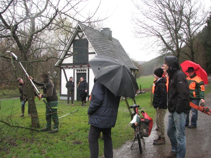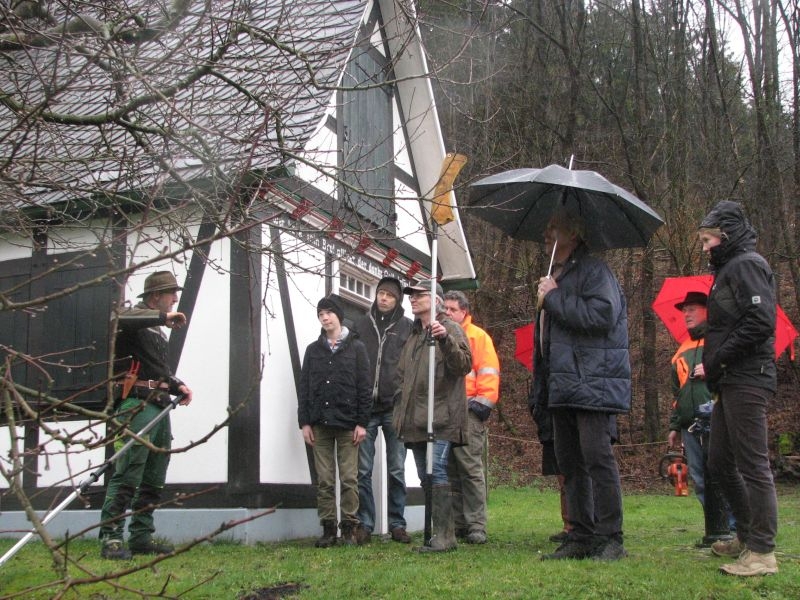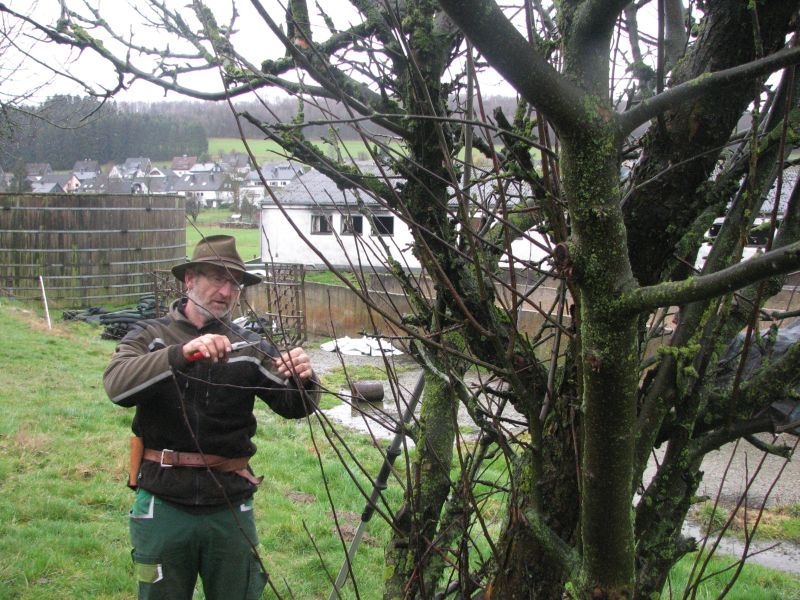 Mit Michael Daub aus Meiswinkel hatten wir einen hervorragenden weil sachkundigen Referenten gewonnen, der zudem mit eigens mitgebrachten jungen Bäumen und einem kompletten Werkzeugsatz nicht nur hervorragend vorbereitet war, sondern auch die Dinge sehr kurzweilig erläutern konnte. Die Teilnehmerzahl war mit 12 Personen aufgrund des Wetters nicht so hoch wie erhofft, diejenigen, die teilnahmen, konnten allerdings zur Auswahl geeigneter Baumsorten, zum Pflanzen der Bäume und zum Pflanz- oder zum Pflegeschnitt der Bäume viel Wissenswertes und „Praktikables“ erfahren. An verschiedenen Obstbäumen am Backes und bei „Kiels“ durfte das zuvor erworbene „theoretische“ Wissen dann auch sogleich in praktisches Handeln umgesetzt werden. Ebenfalls in guter Erinnerung bleibt das abschließende Zusammensein bei Kuchen und Kaffee in „Kolwe“ - Küche. Marlene und Walter für die Gastfreundschaft ein Dankeschön …!