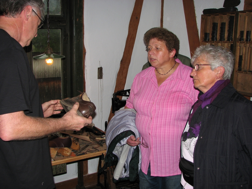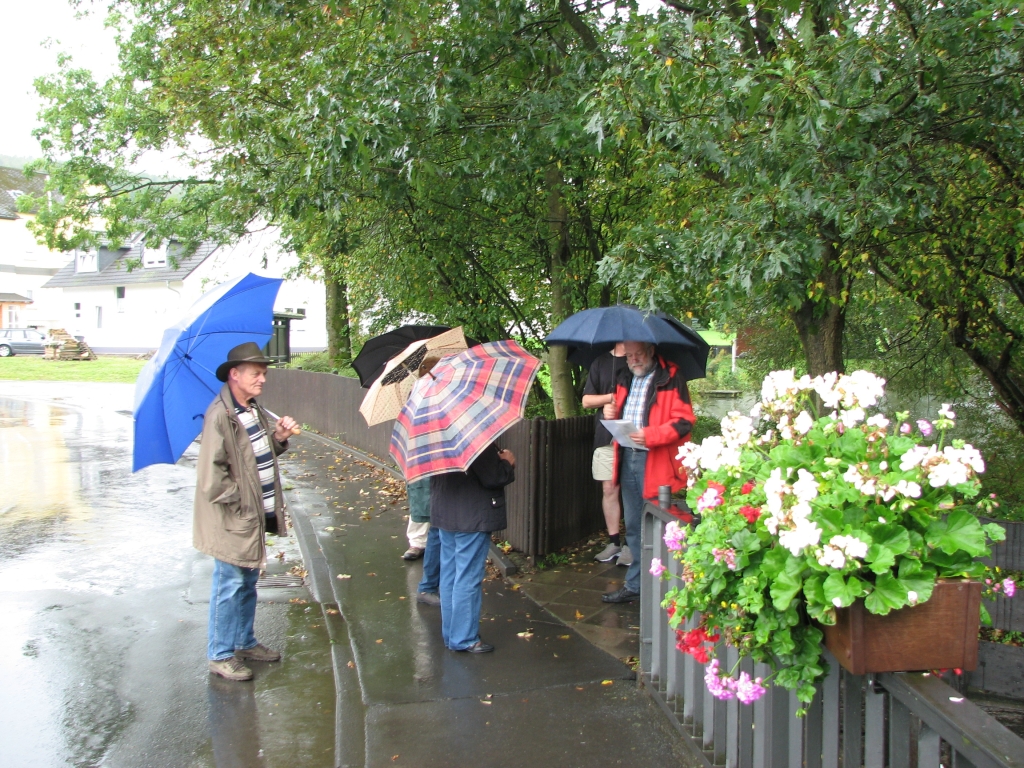 Ihren Anfang nahm die Begehung in der Schuhmacherwerkstatt bei „Schusdersch“, ihr Ende fand sie mit einer Besichtigung von „Möllersch“ Haus und einem gemeinsamen Kaffeetrinken daselbst. Beeinträchtigt wurde die Veranstaltung durch das sehr schlechte Wetter: Aufgrund des starken Dauerregens musste die Begehung schließlich abgekürzt werden. Entschädigt wurden die Teilnehmer allerdings durch den Besuch bei „Möllersch“ und die interessanten Ausführungen von Harald Heck zur Geschichte seines Hauses und dem aktuellen Stand der Renovierungsarbeiten. (Bilder siehe hier)
