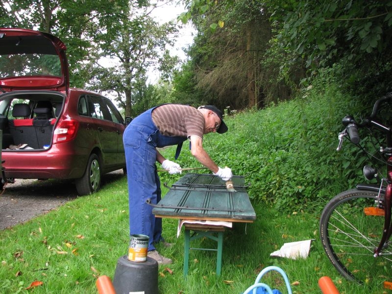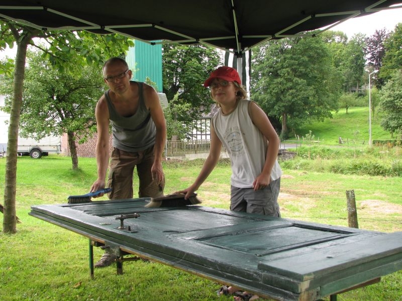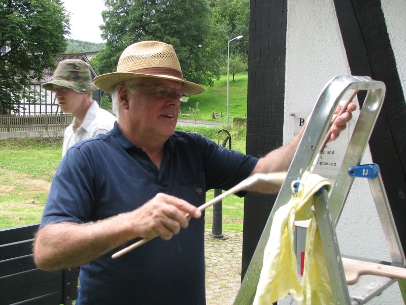 Mit vereinten Kräften stellten sich die Helfer vom Arbeitskreis Dorferneuerung und Dorfgeschichte am Samstag, dem 4. August 2012, dieser Aufgabe. Schäden am Fachwerk wurden beseitigt, rostende Schrauben am Gesimse wurden ausgetauscht und die Türen und Läden, aber auch die Bänke vor dem Backes erhielten einen frischen Anstrich. Zwischenzeitlich stärkten sich die Helfer bei Kaffee und reichlich Kuchen. Eine gute Verpflegung ist eben die Grundlage jeder guten Arbeit …. !