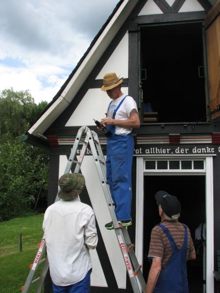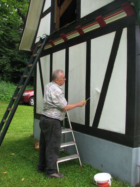 Seit nunmehr 14 Jahren bildet der am Zinnwald gelegene Backes einen Blickfang im Ortsbild von Langenholdinghausen. Damit Wind und Wetter dem Gebäude auch zukünftig nichts anhaben können, bedarf das Fachwerk, bedürfen Türen und Läden allerdings der regelmäßigen Pflege.