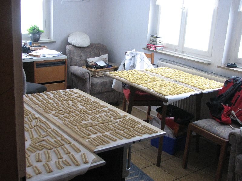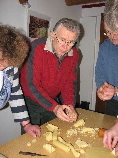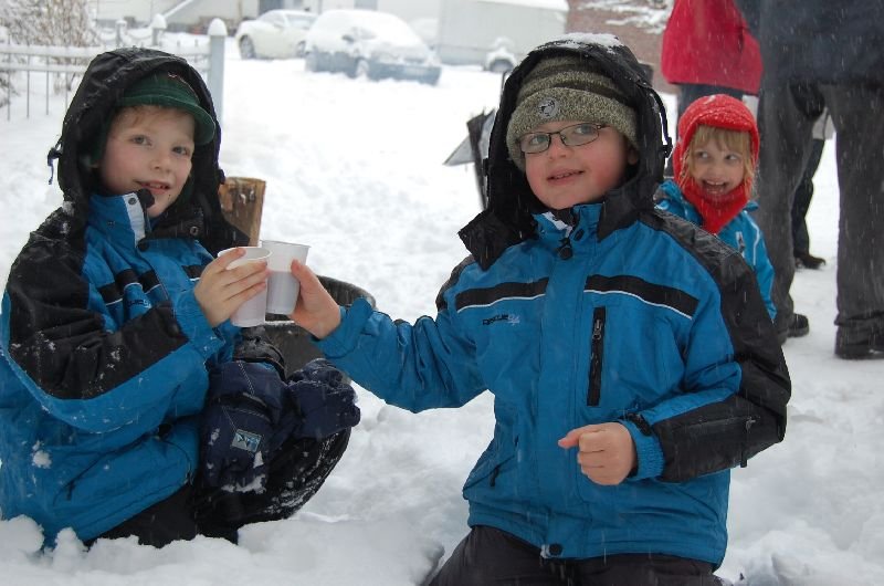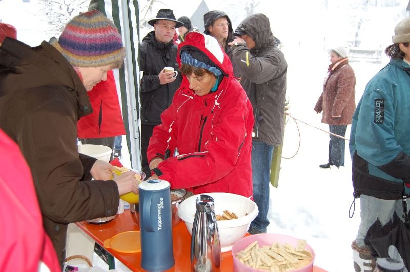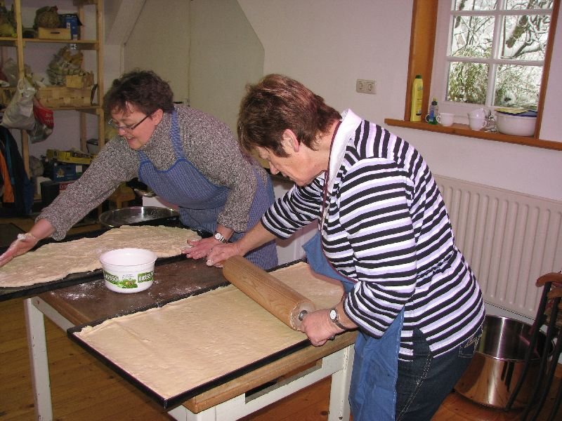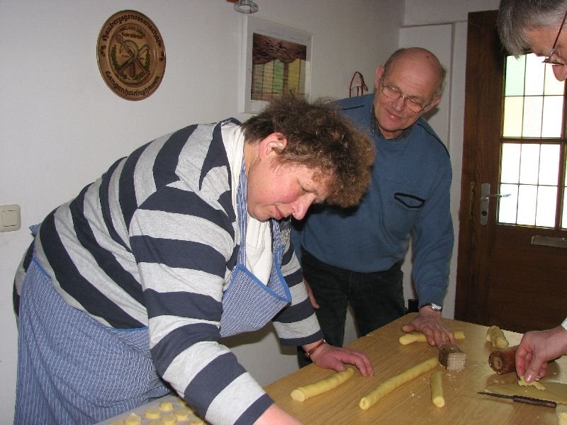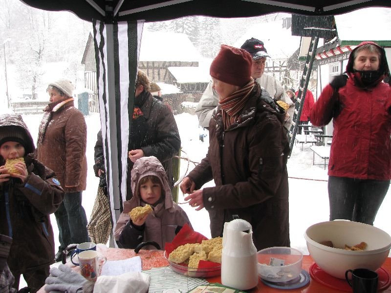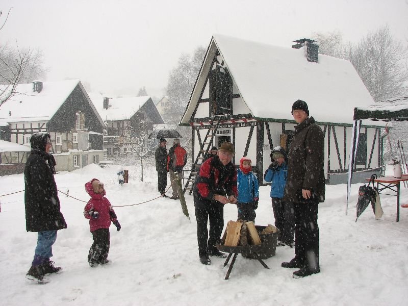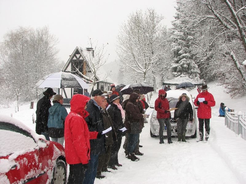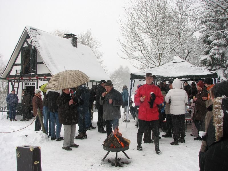 Der Posaunenchor und der Arbeitskreis Dorferneuerung hatten zu der Veranstaltung gemeinsam eingeladen. Und trotz des starken Schneefalls waren der Einladung viele Familien gefolgt. Im Backhaus wurde von den Helfern des Arbeitskreises zunächst Streuselkuchen gebacken, danach kam das „Spritzgebäck“ in den Steinofen. In der Küche von „Kolwe“ waren dazu rund 16 kg Teig zu Plätzchen verarbeitet und auf die Backbleche aufgelegt worden. Gäste und Musiker waren demnach mit schmackhaftem Gebäck, aber auch mit Kaffee und heißem Kakao bestens versorgt. Entstehung und Bedeutung der vom Posaunenchor vorgetragenen Lieder wurde vom Chorleiter ansprechend erläutert, die zuvor verteilten Liedtexte erleichterten auch den nicht so ganz „textfesten“ Sängerinnen und Sängern das Mitsingen. „Eine schöne, stimmungsvolle Veranstaltung“ – so das Urteil der Besucher. Kurzweilig war die Zeit am Backes aber auch für die Kinder: Sie vergnügten sich in „Kolwe“ Wiese im reichlich vorhandenen Schnee!