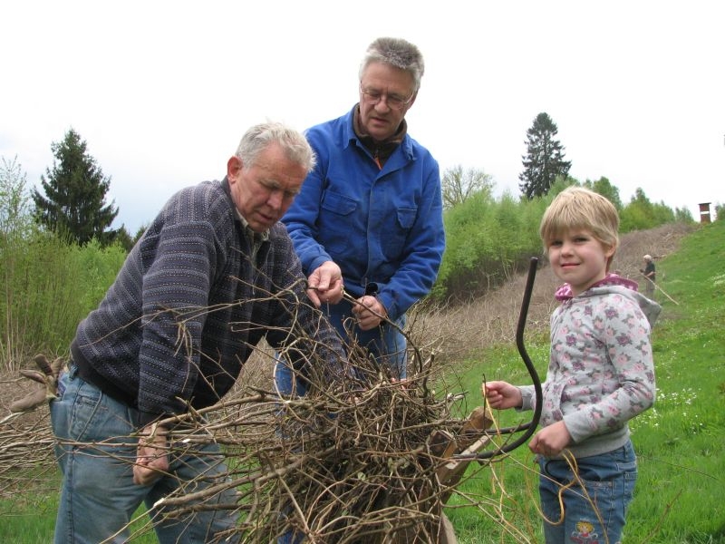 Schon in den Wintermonaten war auf einer solche Fläche in der angrenzenden Niederholzklauer Flur viel Birkengehölz niedergeschnitten worden, das jetzt mit dem Knipp auf die richtige Länge gebracht und mit Hilfe der Schanzenbinder zusammen gebunden wurden. Zum gemeinsamen Schanzenmachen gehört natürlich auch ein zünftiges Kaffeetrinken im Wald. Doch kaum war der Kaffee eingeschenkt, begann es kräftig zu regnen, so dass die Arbeiten früher als geplant eingestellt werden mussten. Um auch für das nächste Jahr genügend Schanzenvorräte zu haben, ging es am Abend des 18. Juni 2013 erneut in den Wald – diesmal bei trockenem Wetter. Eingelagert wurden die frischen Schanzen in der Scheune von „Kolwe“. Hier können sie bis zu ihrer Verwendung im Steinofen gut durchtrocknen.