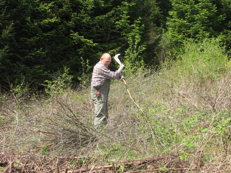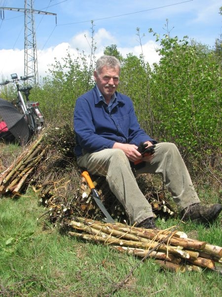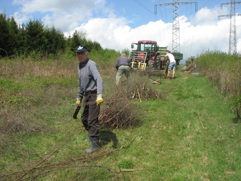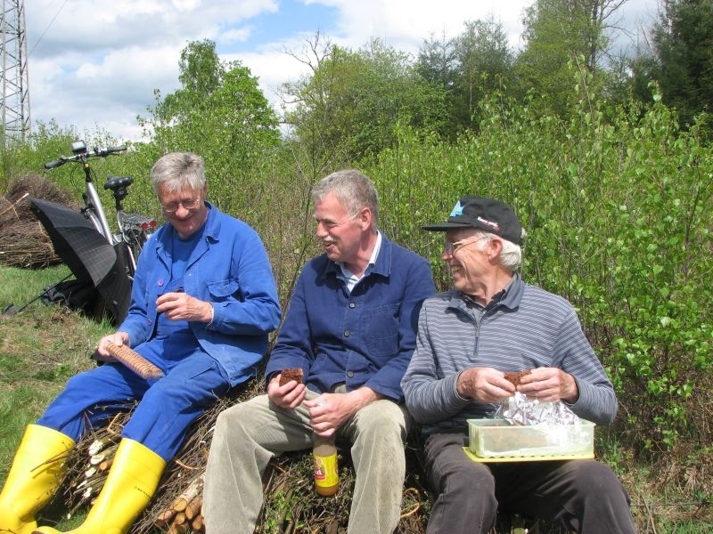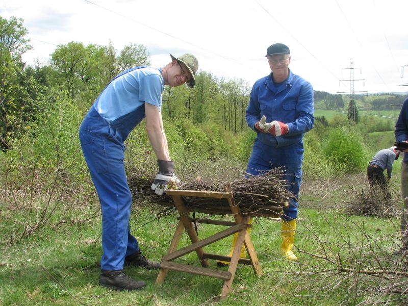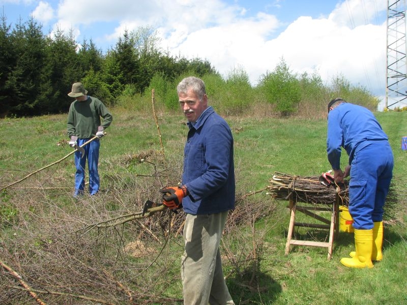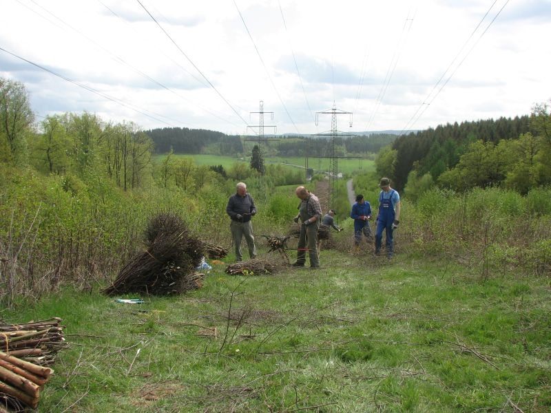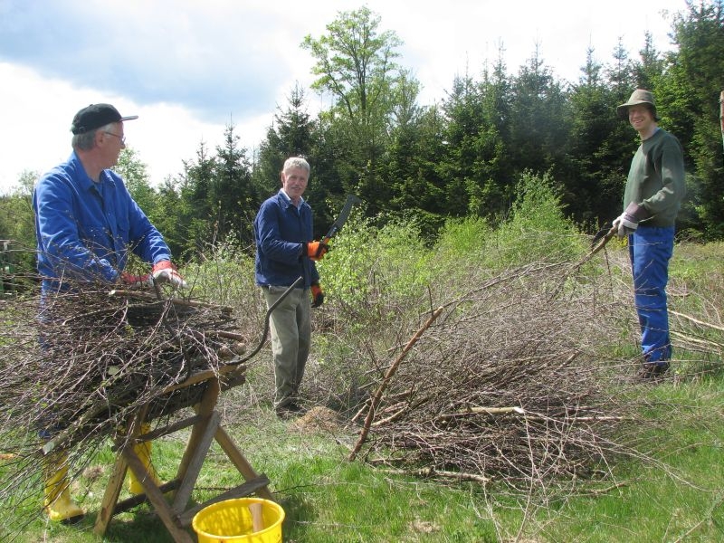 am 9. Mai 2015 am „Goldseifen“, wo unter der dort verlaufenden Hochspannungsleitung einige Wochen zuvor junges Birkengehölz von einem Mitstreiter des Arbeitskreises auf den Stock gesetzt worden war. Während es sich hierbei um geschmeidiges und deshalb gut zu verarbeitendes Strauchwerk handelte, gestaltete sich der zweite Einsatz hinter „Gisselersch“ am 5. Juni 2015 schon etwas unangenehmer: Nicht allein wegen des schon länger dort liegenden und damit recht trockenen Gehölzes, sondern auch wegen der nur schwer zu ertragenden Hitze, wie sie an diesem Tage zu verzeichnen war. Aber auch diese Anstrengung wurde gemeistert, so dass jetzt 112 neue Schanzen im nächsten Jahr für genügend Hitze im Steinofen sorgen können.