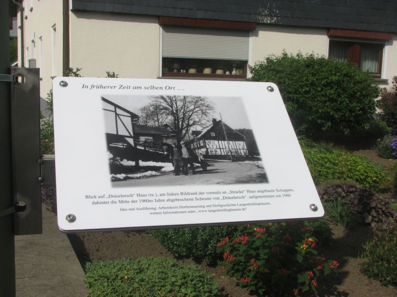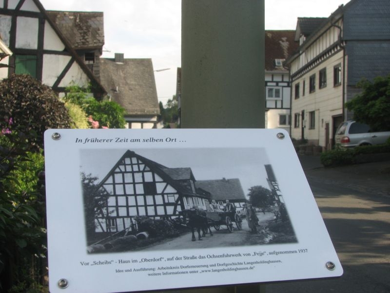 Nach längerer Vorbereitung war es so weit: „In früherer Zeit am selben Ort“ - unter dieser Überschrift installierte der Arbeitskreis Dorferneuerung und Dorfgeschichte am 22. und 23.Juli 2015 über den Ort verteilt insgesamt neun Bildtafeln mit historischen Aufnahmen aus der Zeit zwischen 1916 und 1962 – jede möglichst genau an der Stelle, von der aus der Fotograf das damalige Panorama auf Zelluloid gebannt hatte.