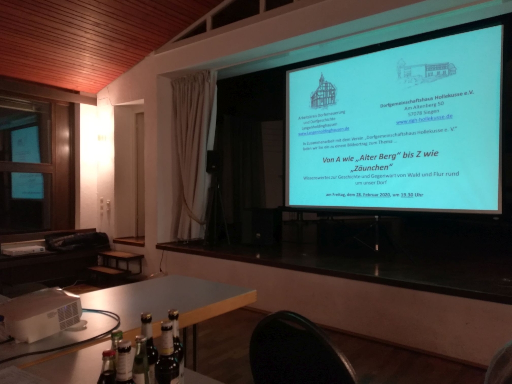 Mit der Entstehung der dörflichen Flur, den alten Flurnamen, aber auch den Veränderungen der dörflichen Flur in der älteren und jüngeren Zeit befasste sich ein Bildvortrag mit dem Titel Von A wie Alter Berg bis Z wie Zäunchen Wissenswertes zur Geschichte und Gegenwart von Wald und Flur rund um Langenholdinghausen am Freitag, dem 28. Februar 2020, um 19.30 Uhr im Dorfgemeinschaftshaus am Alten Berg.