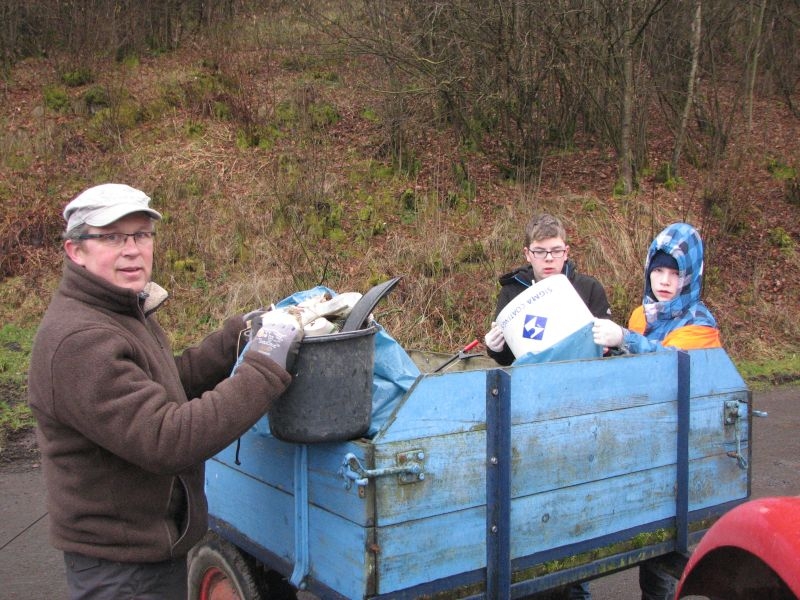 – von der Bierflasche über Drahtrollen bis hin zum preiswert entsorgten Bauschutt – auf die Wagen gepackt. Insbesondere an den Hauptstraßen war wieder fleißiges Auflesen angesagt, eine Aufgabe an der sich insbesondere auch die Kinder mit Eifer und Ausdauer beteiligten. Anscheinend entsorgen nach wie vor viele Zeitgenossen ihre Getränkedosen, Verpackungen von Süßigkeiten oder auch nur Papiertaschentücher bequem durch das offene Autofenster. Und im Laufe eines Jahres kommt rechts und links der Straßen wieder viel Müll zusammen. Als Lohn für den mehrstündigen Einsatz standen danach in „Gisselersch“ Scheune Kaffee und Kuchen für die Helfer bereit.