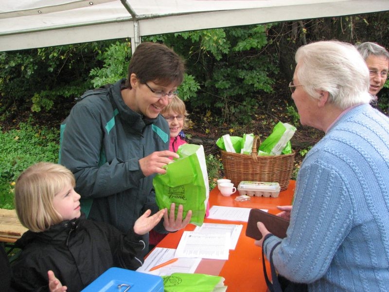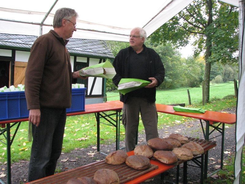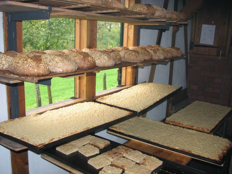 Drei Tage lang hatten die Bäcker des Arbeitskreises den Steinofen vorgeheizt, am Samstag wurden dann um 7.00 Uhr die ersten und um 15.00 Uhr die letzten Brote eingeschossen. Schnell ausverkauft war auch der frisch aus dem Ofen kommende Streuselkuchen. Schade nur, dass das Wetter diesmal nicht dazu einlud, sich länger am Backes aufzuhalten. Und gemeinsame Gespräche unter dem Regenschirm fallen in der Regel doch etwas kürzer aus als auf der Bank vor dem Backhaus im Sonnenschein …(Bilder siehe hier)